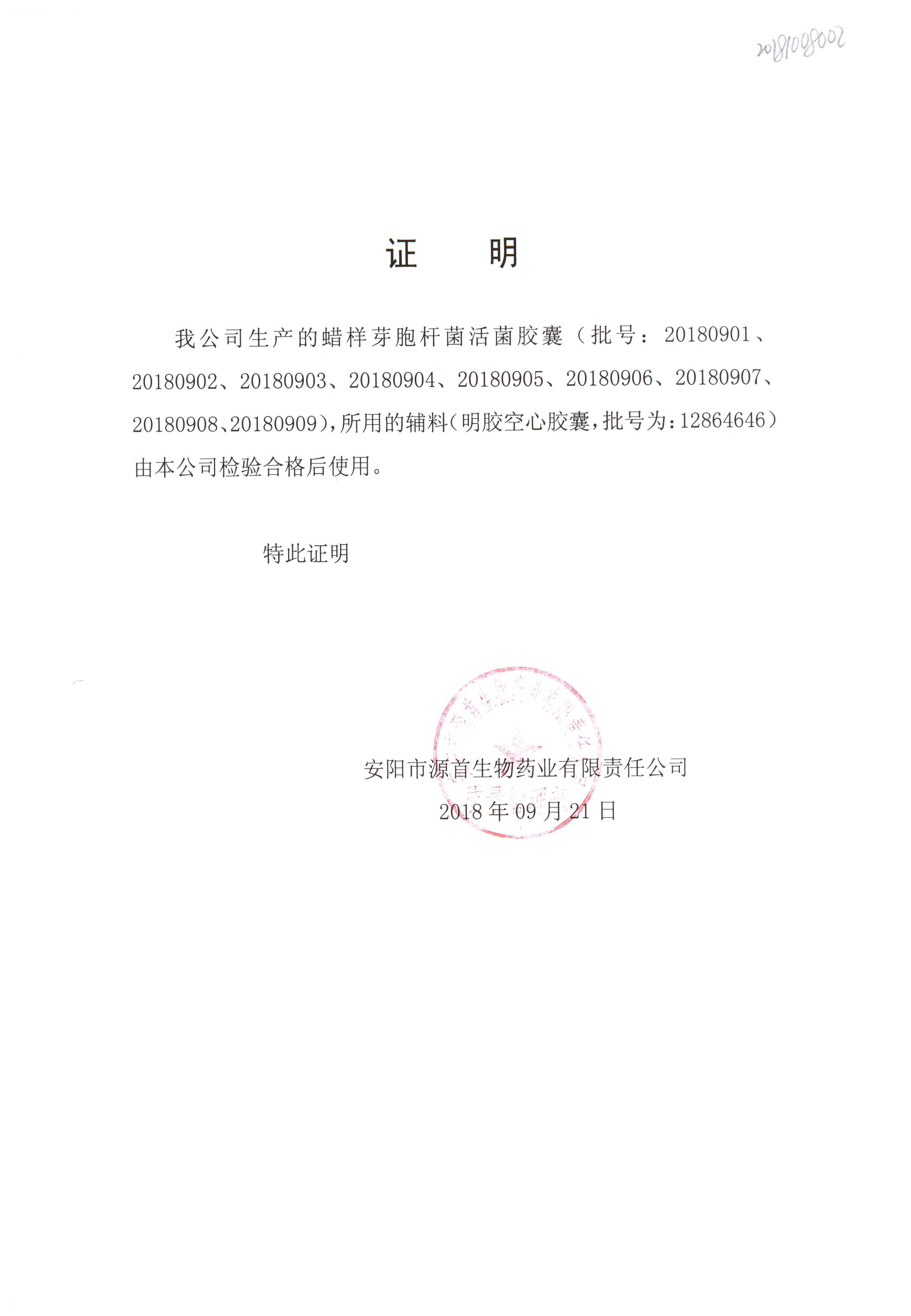 蠟樣芽孢桿菌活菌膠囊(源首) | 0.25g | 20180907(2/3) | 查看詳情 |