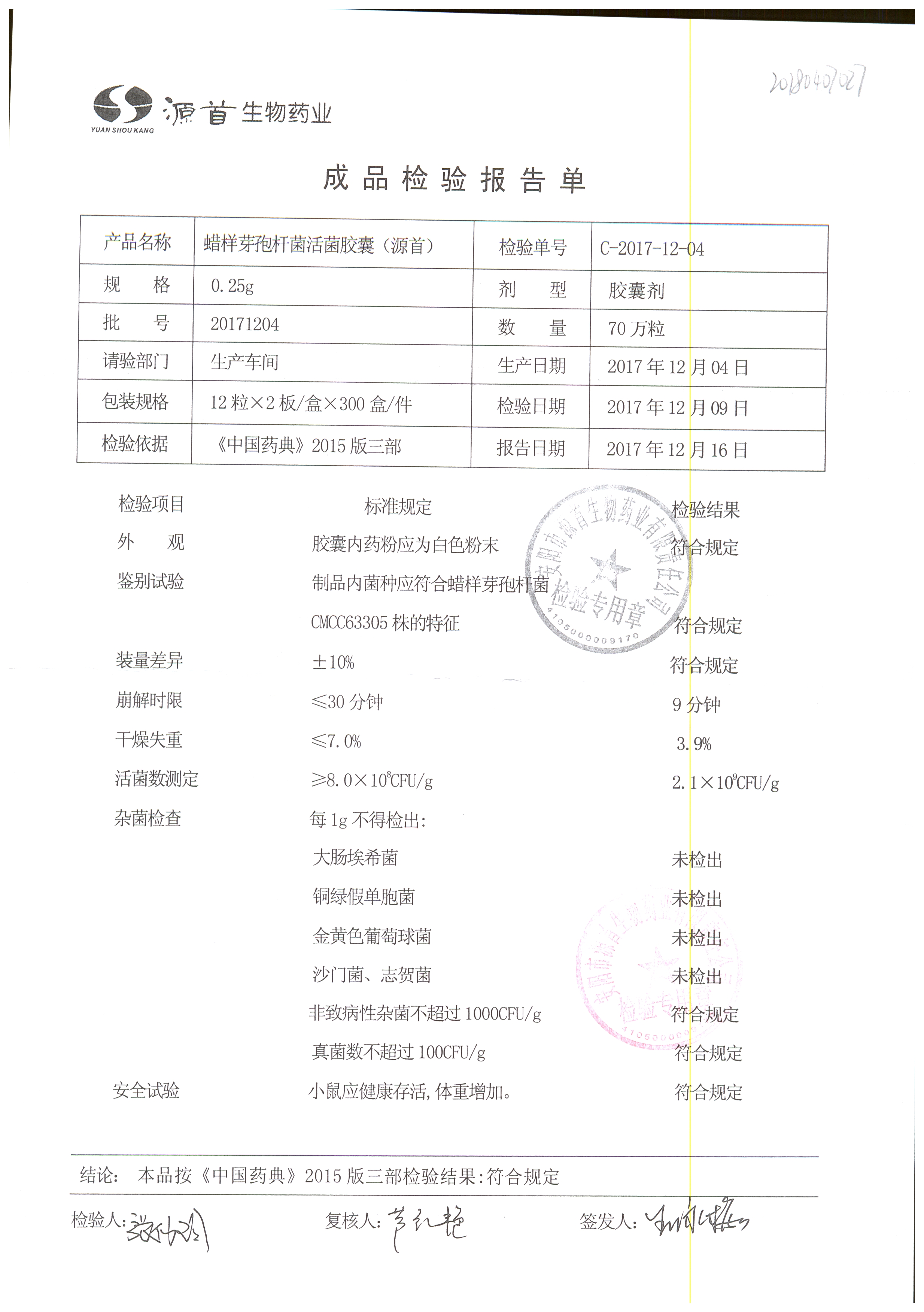 蠟樣芽孢桿菌活菌膠囊(源首) | 0.25g | 20180504(2/3) | 查看詳情 |