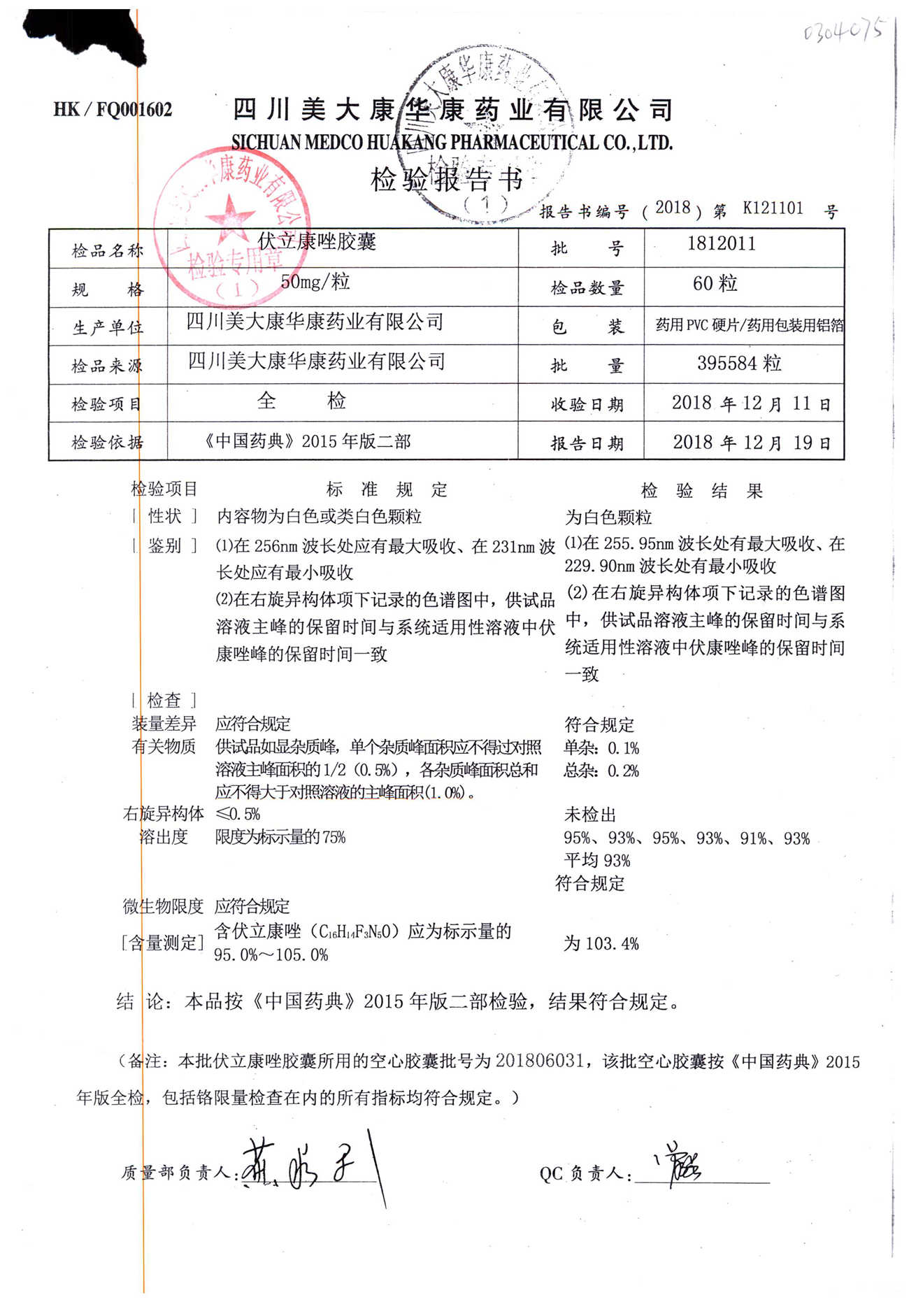 | 伏立康唑膠囊 | 50mg | 1812011 | 查看詳情 |