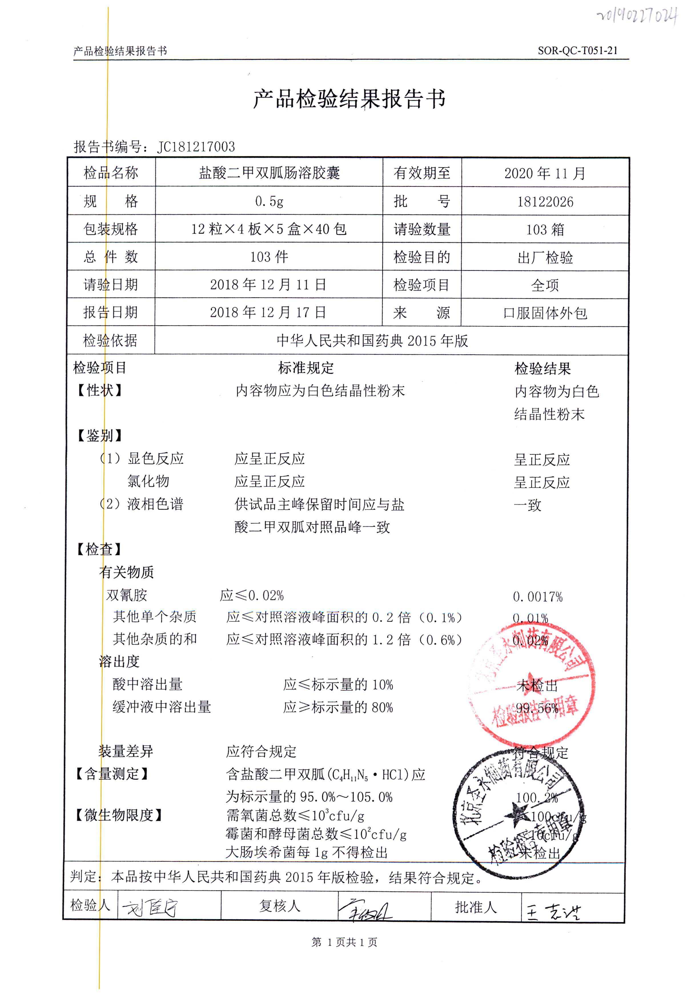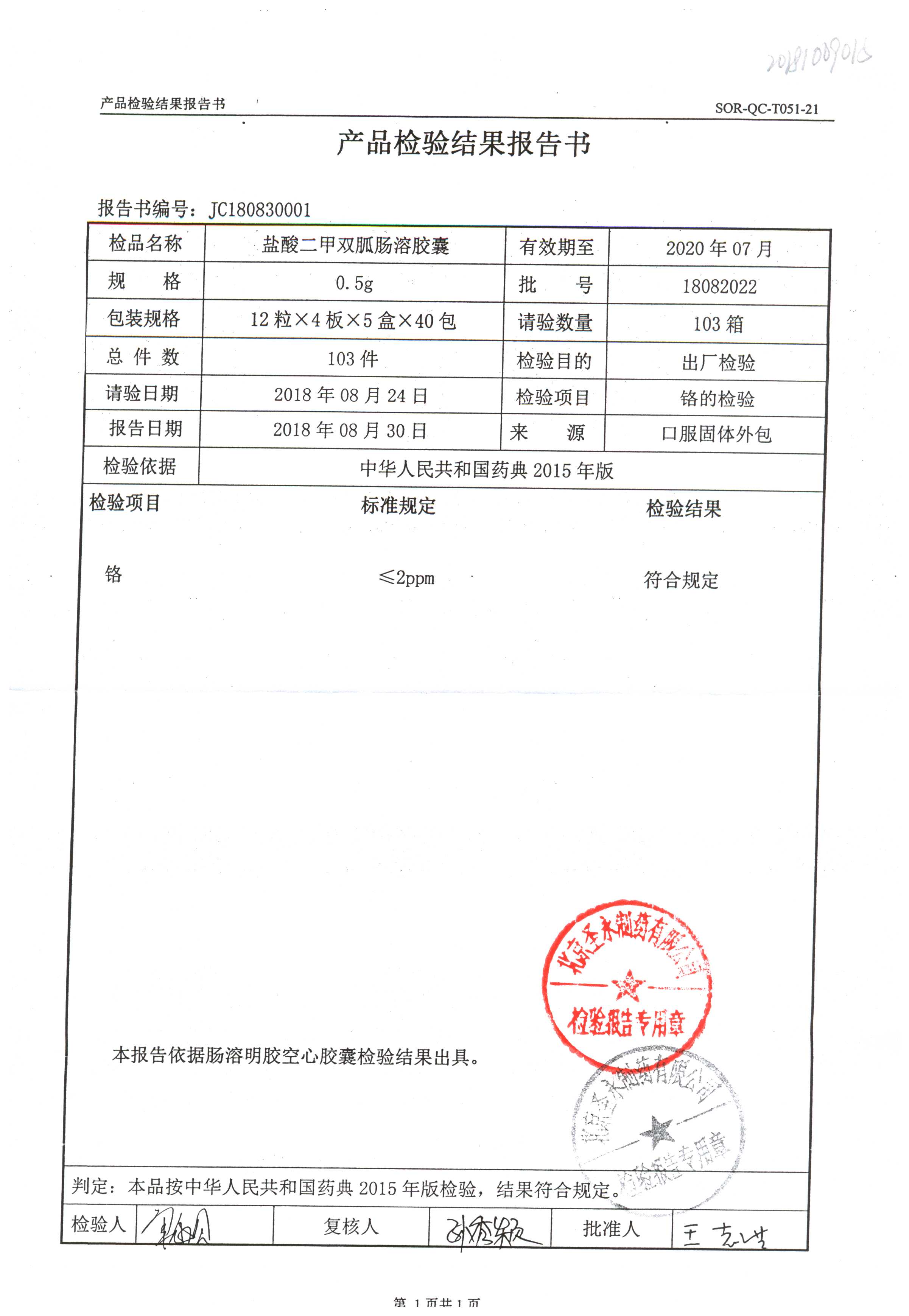 | 鹽酸二甲雙胍腸溶膠囊 | 0.5g*48s | 18011019(2/2) | 查看詳情 |
