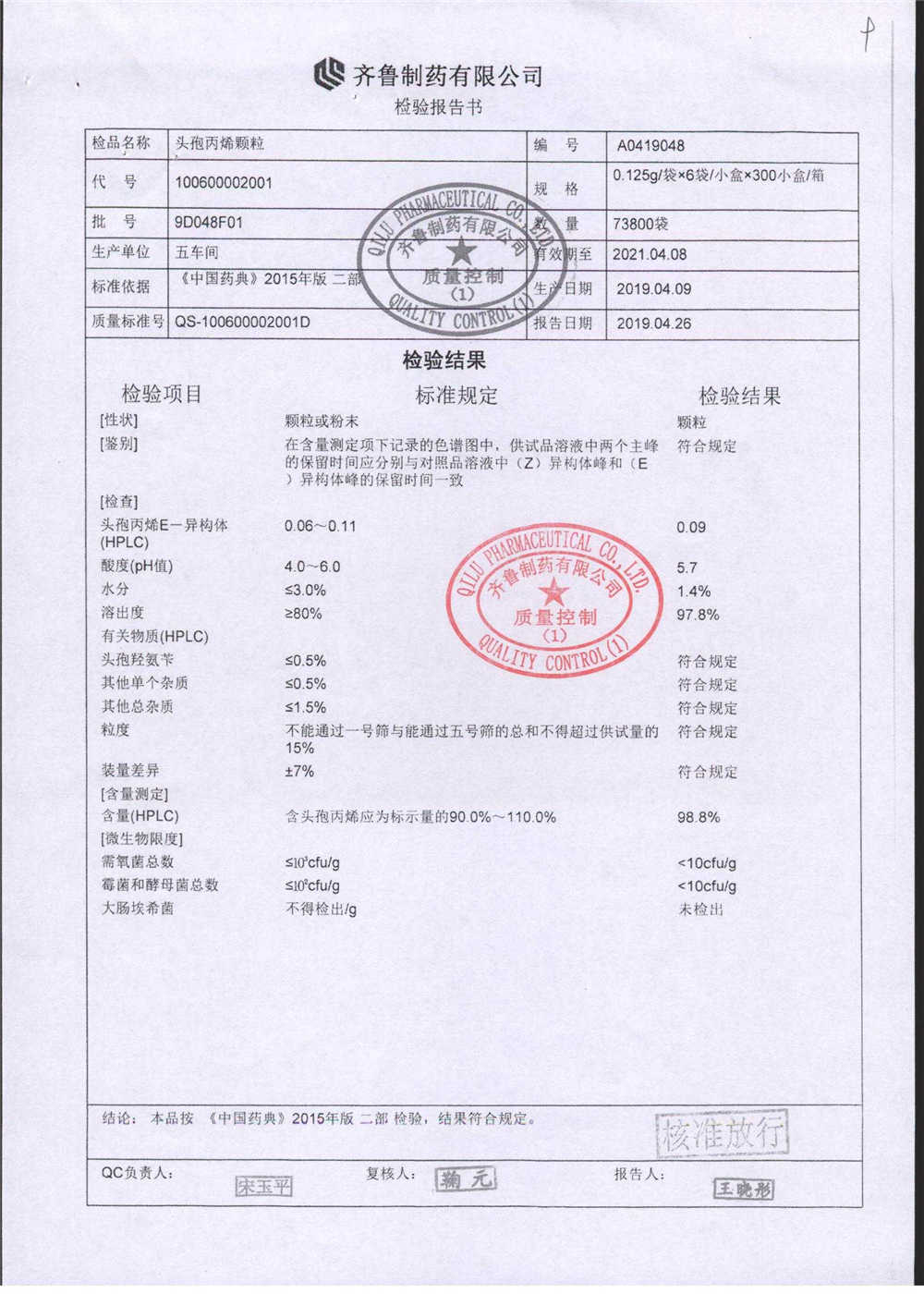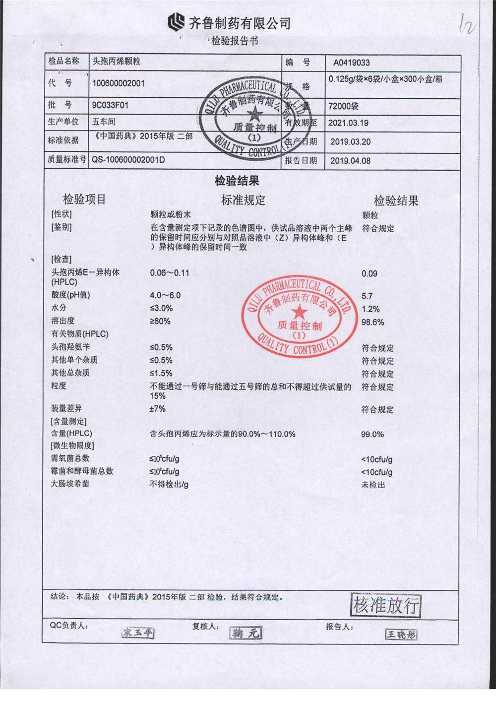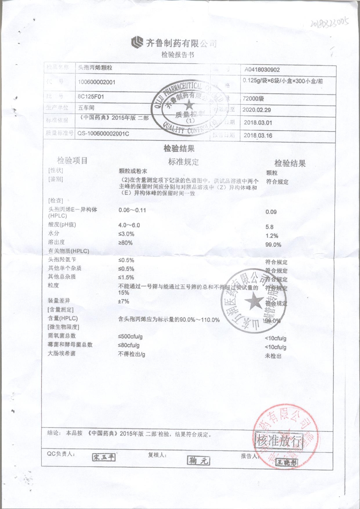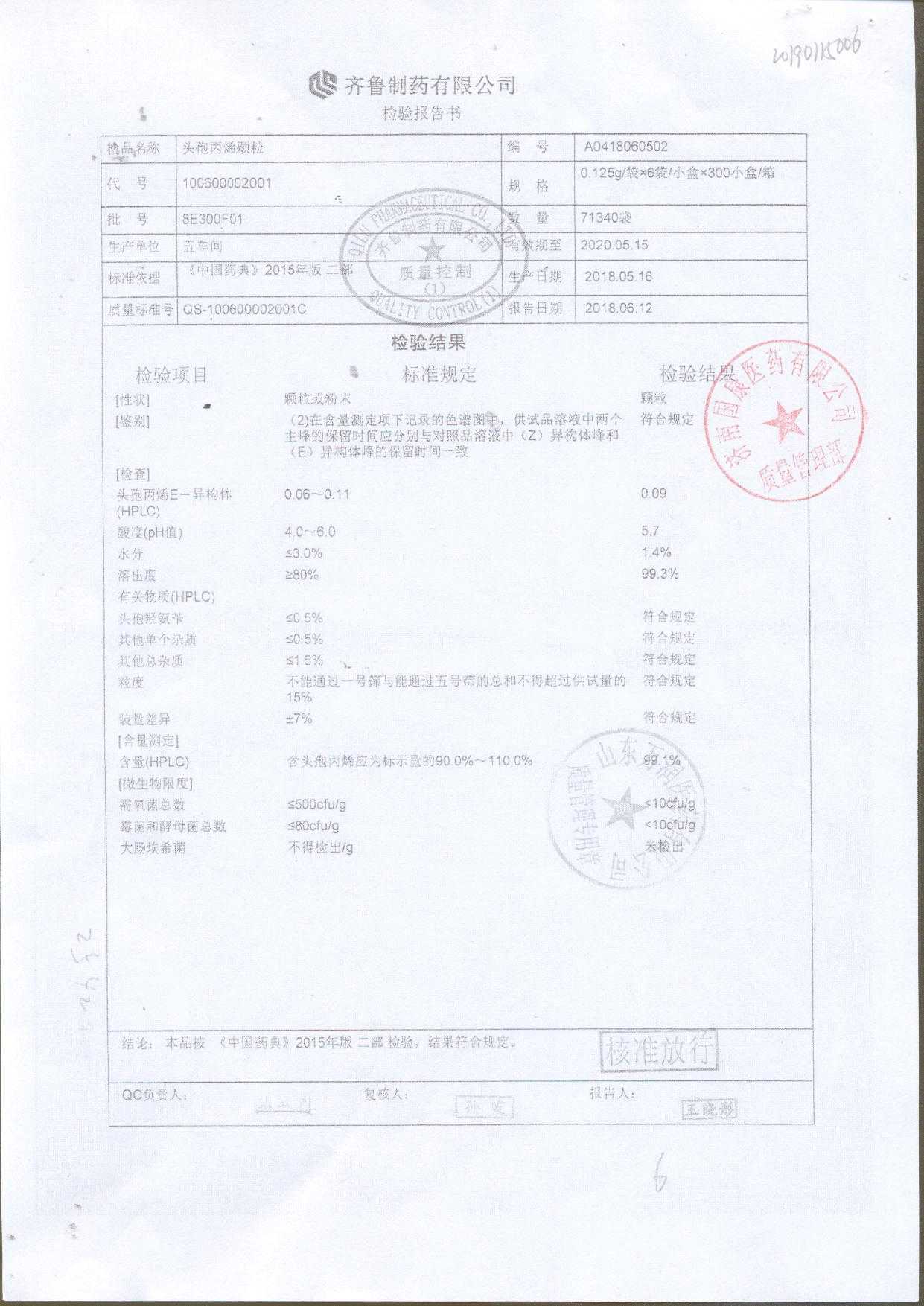 | 頭孢丙烯顆粒 | 0.125g*6袋 | 8C125F01 | 查看詳情 |