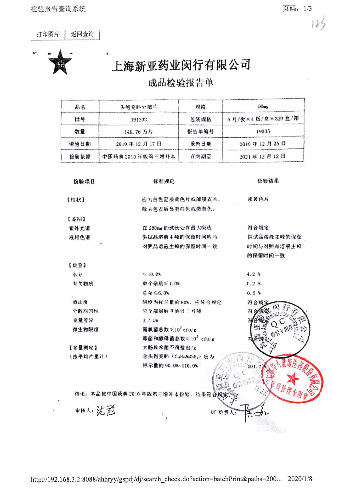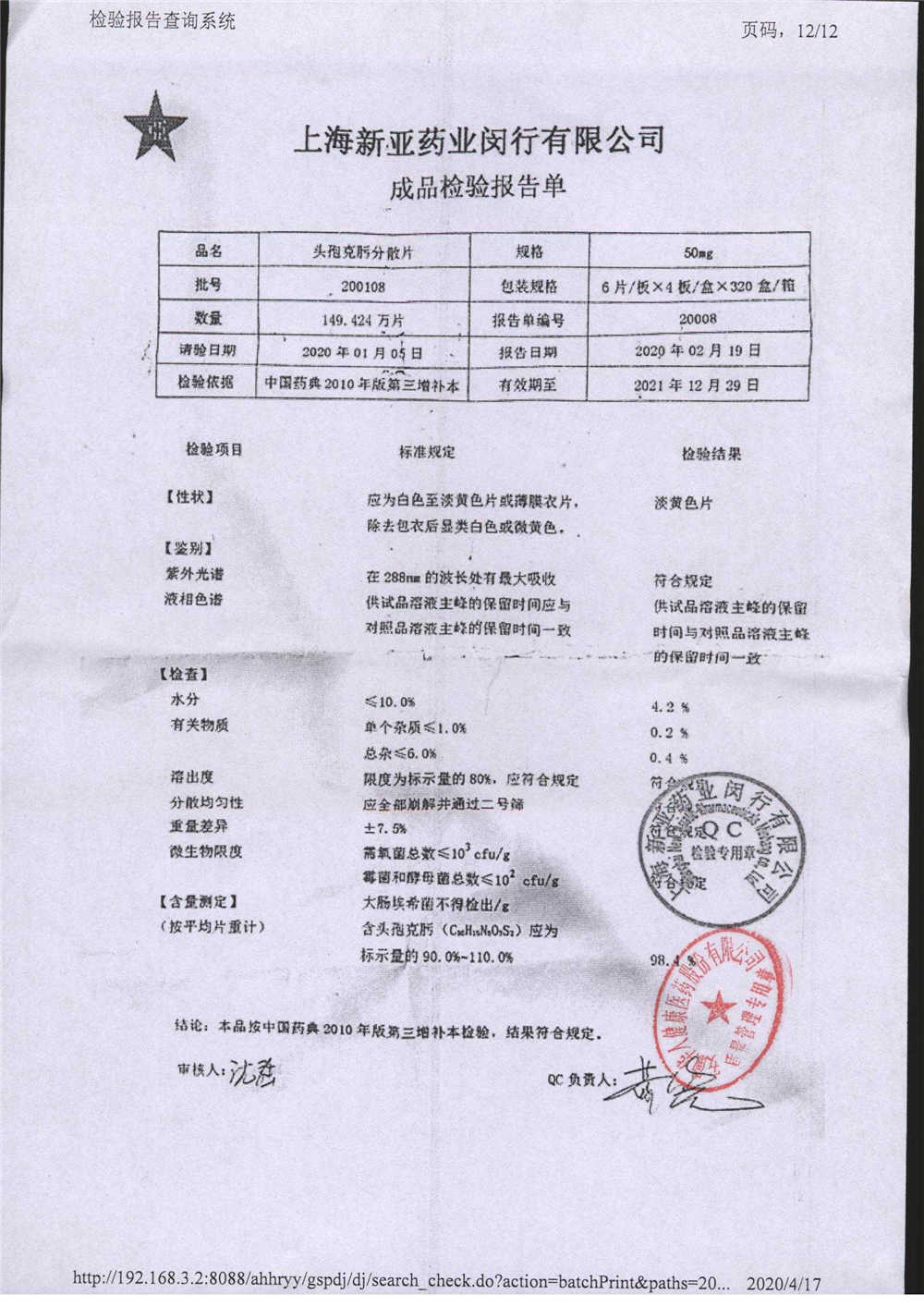 | 頭孢克肟分散片 | 50mg*24s | 210105 | 查看詳情 |