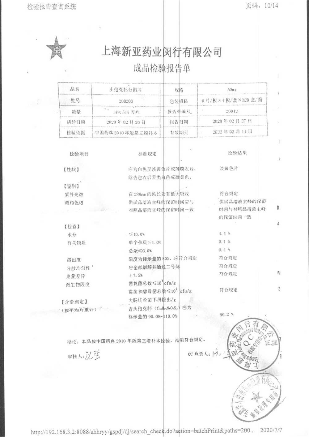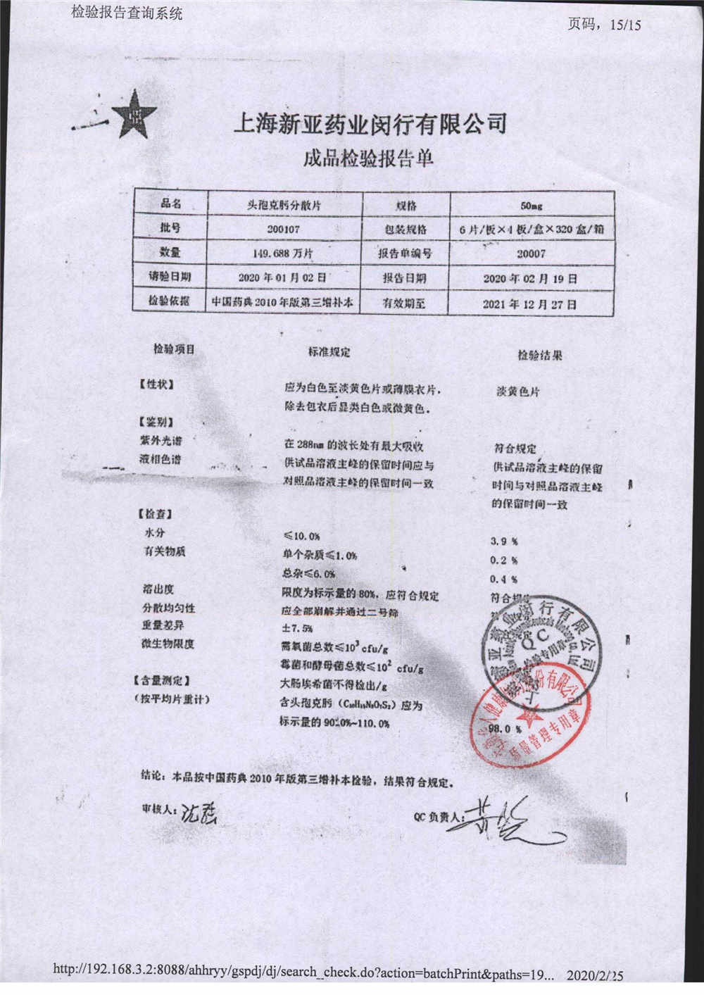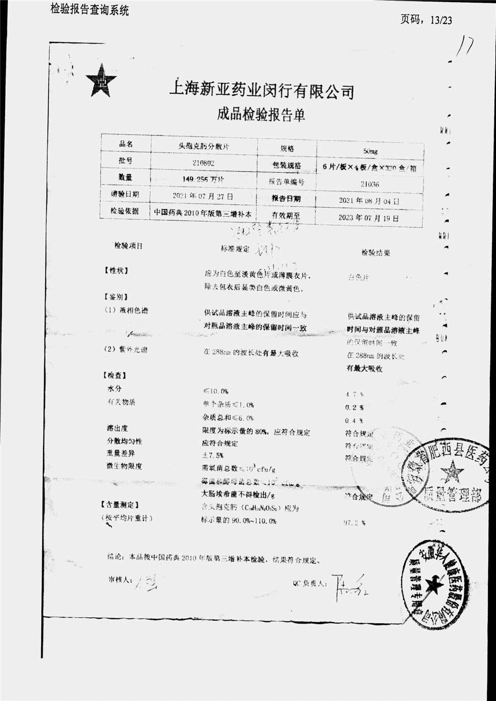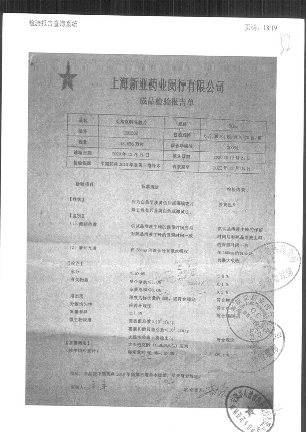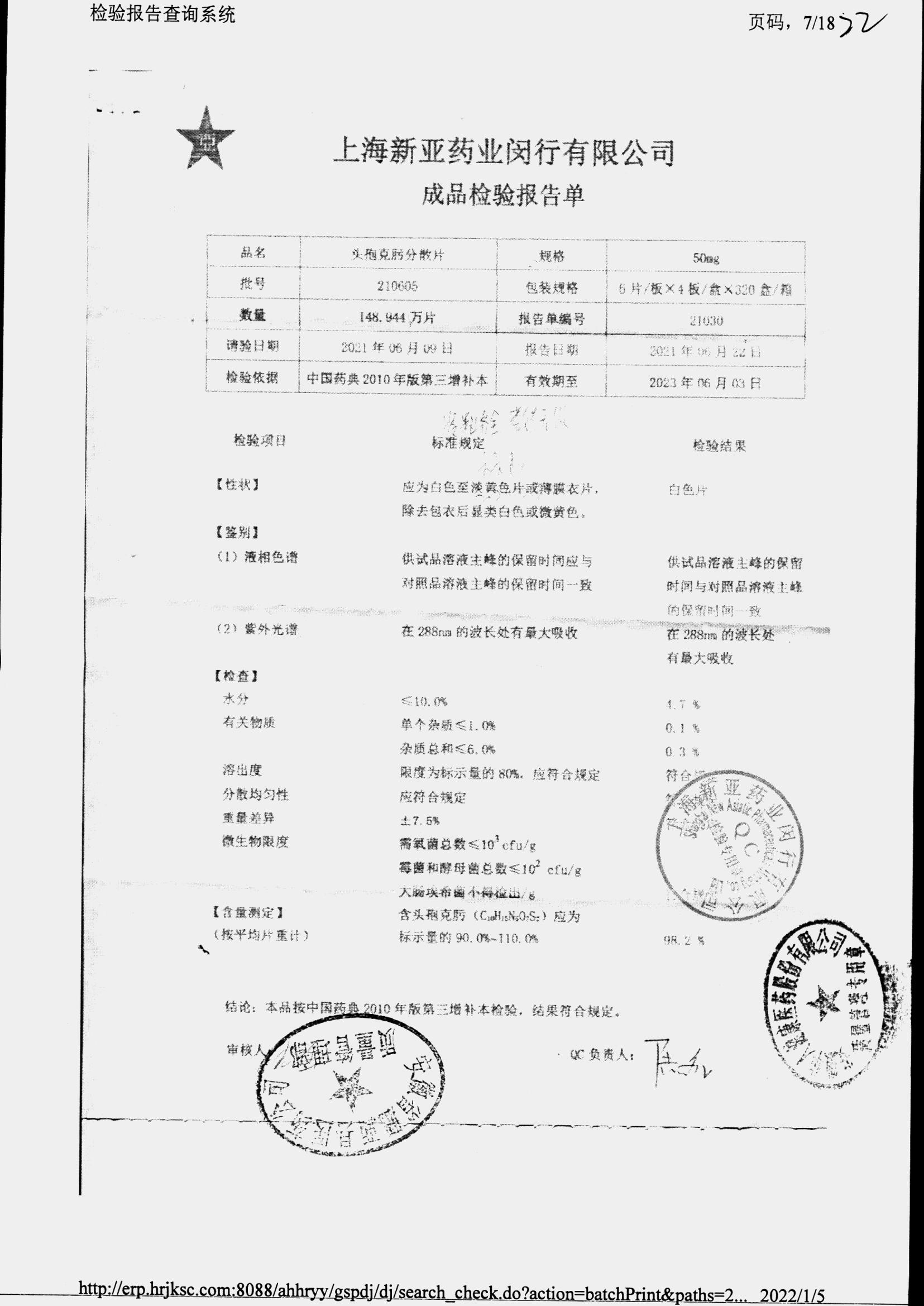 | 頭孢克肟分散片 | 50mg*24s | 210203 | 查看詳情 |