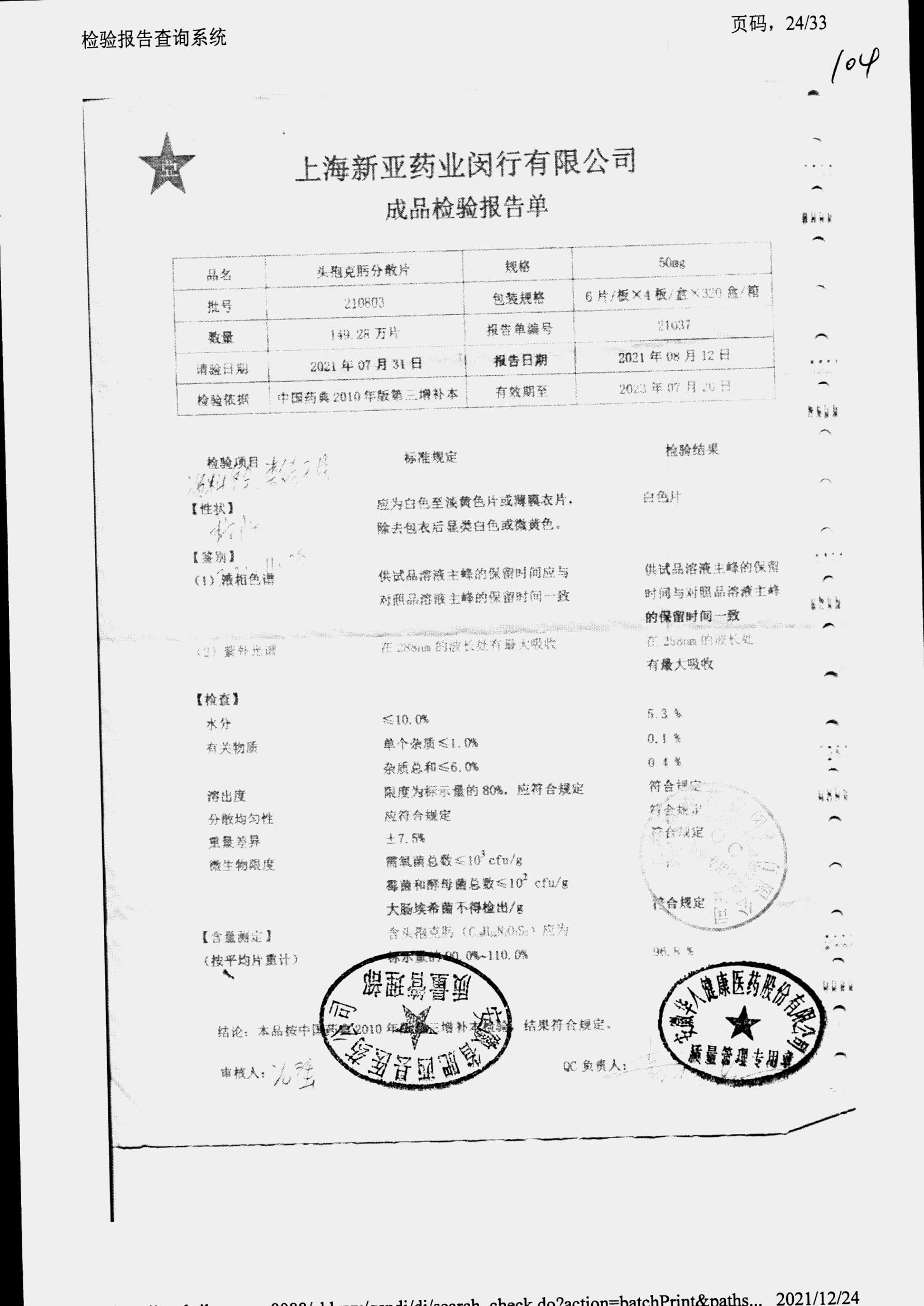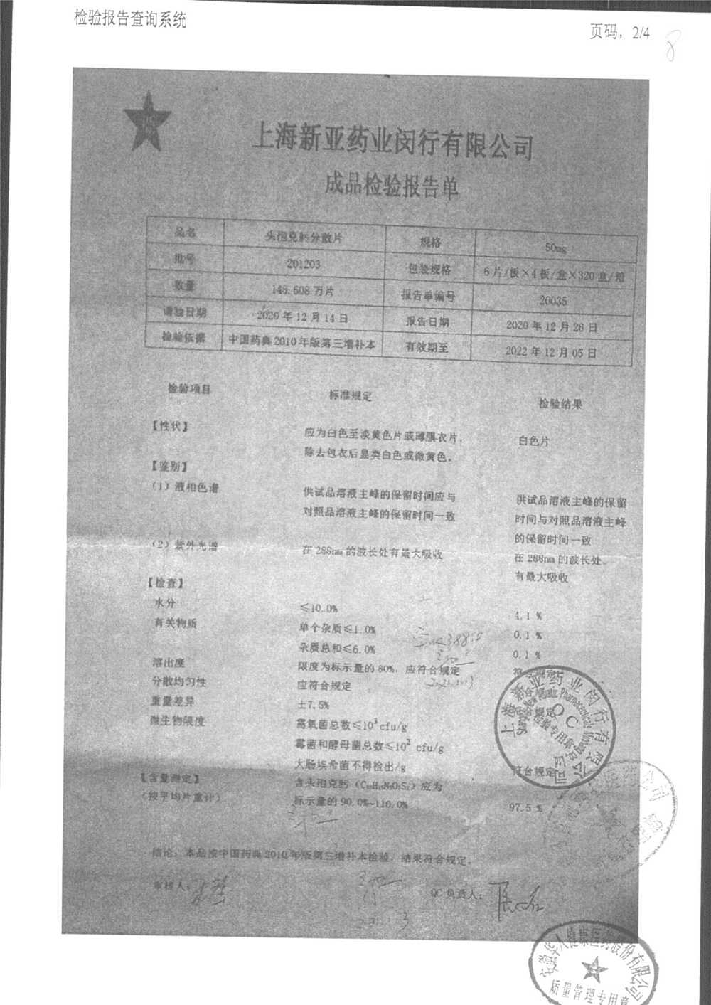 | 頭孢克肟分散片 | 50mg*24s | 210404 | 查看詳情 |