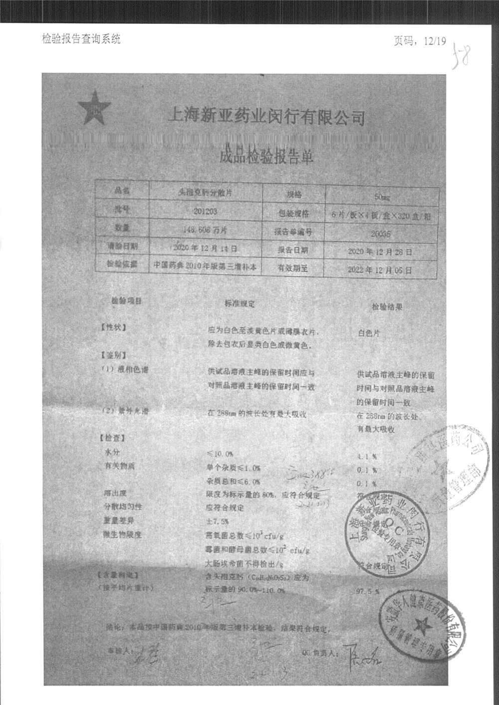| 頭孢克肟分散片 | 50mg*24s | 210303 | 查看詳情 |