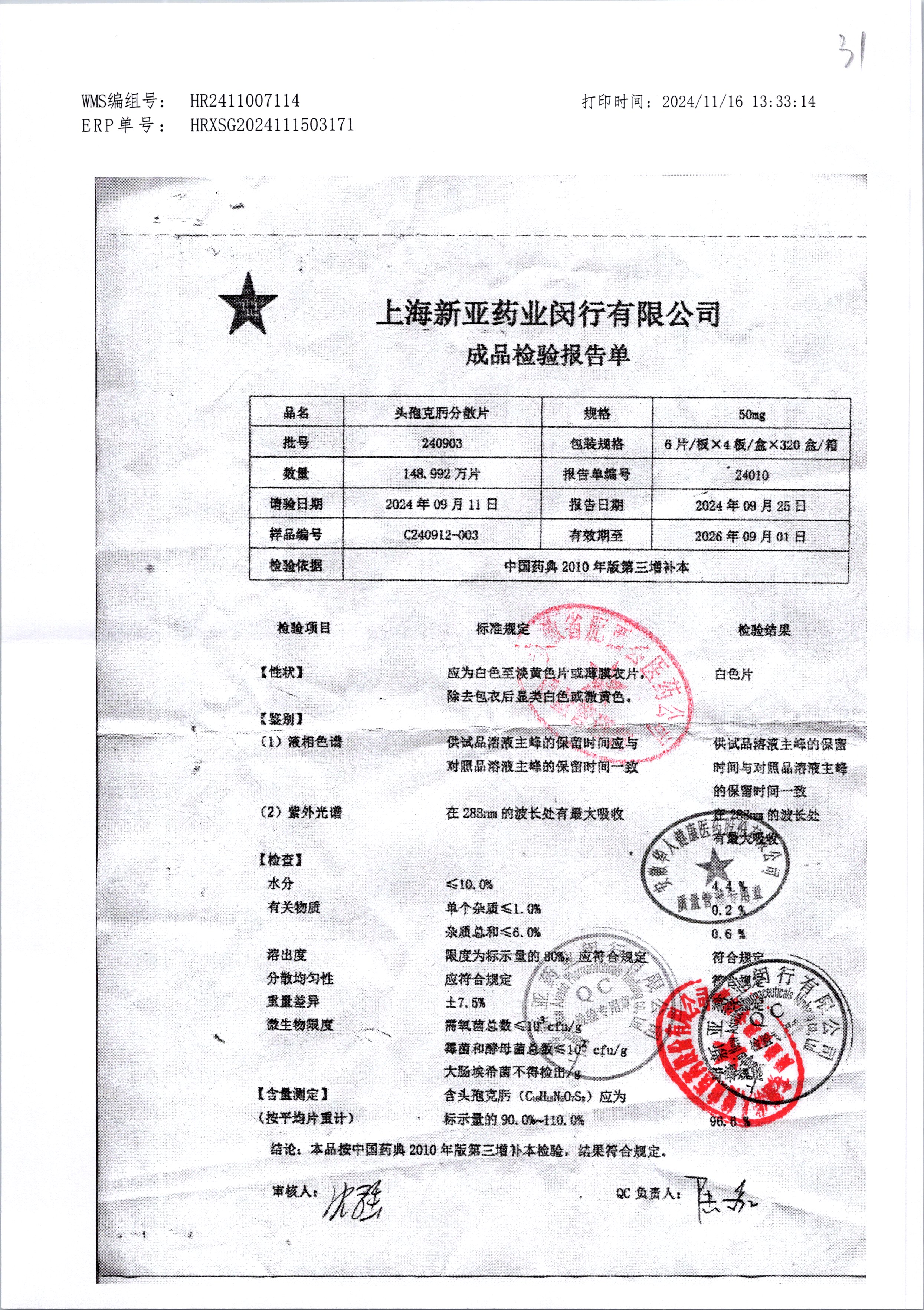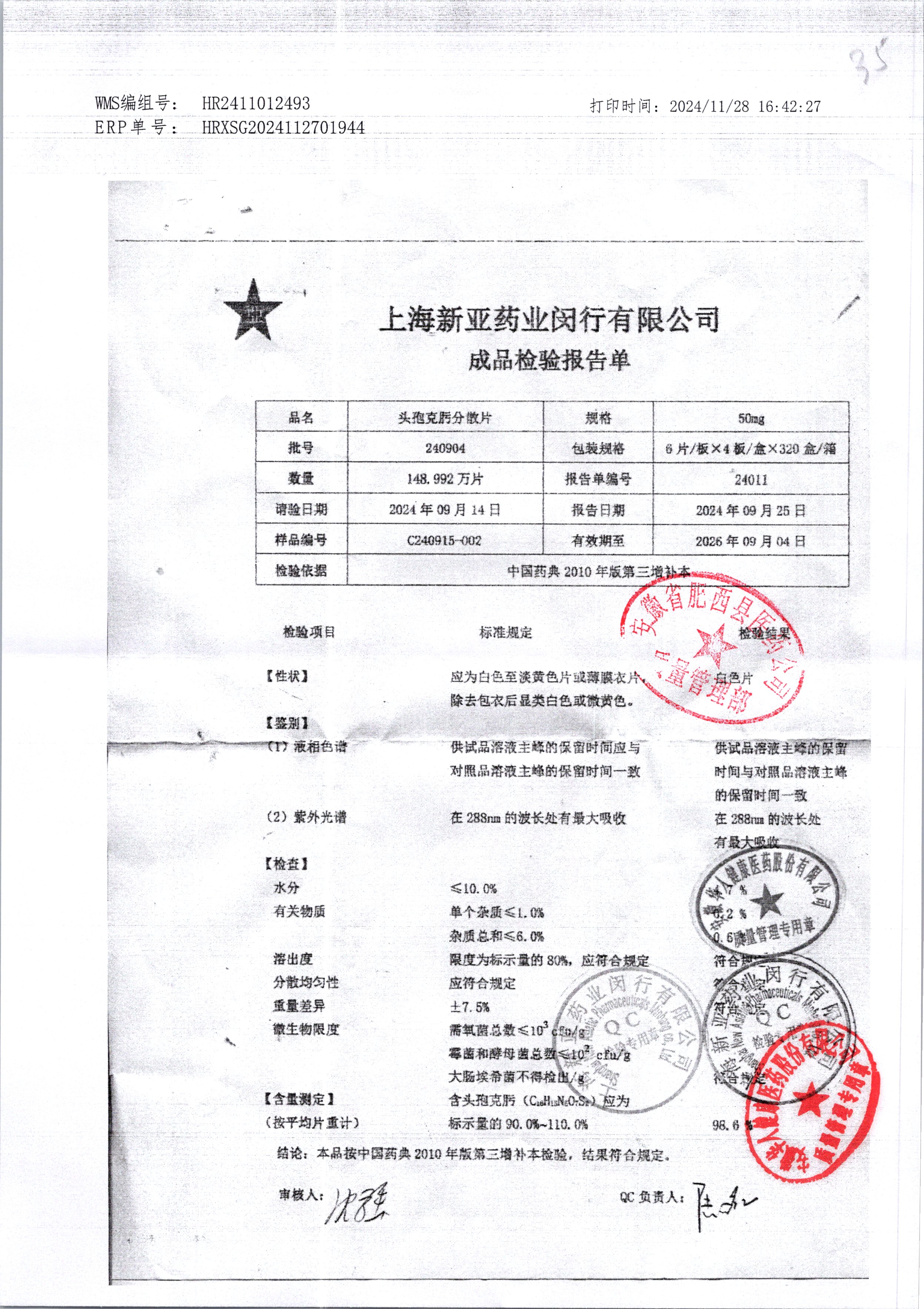 | 頭孢克肟分散片 | 50mg*24s | 241203 | 查看詳情 |