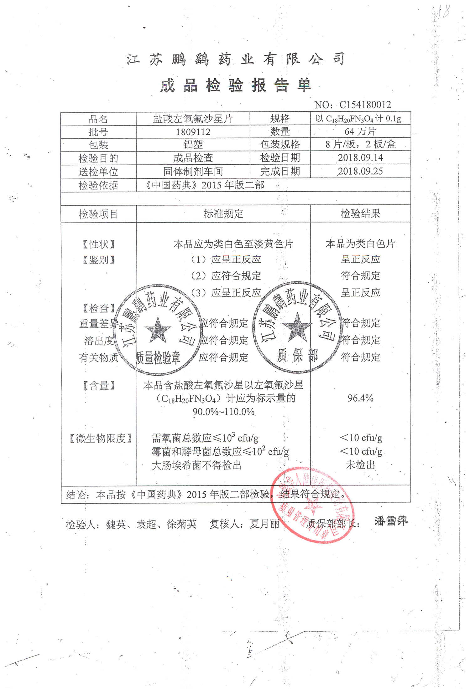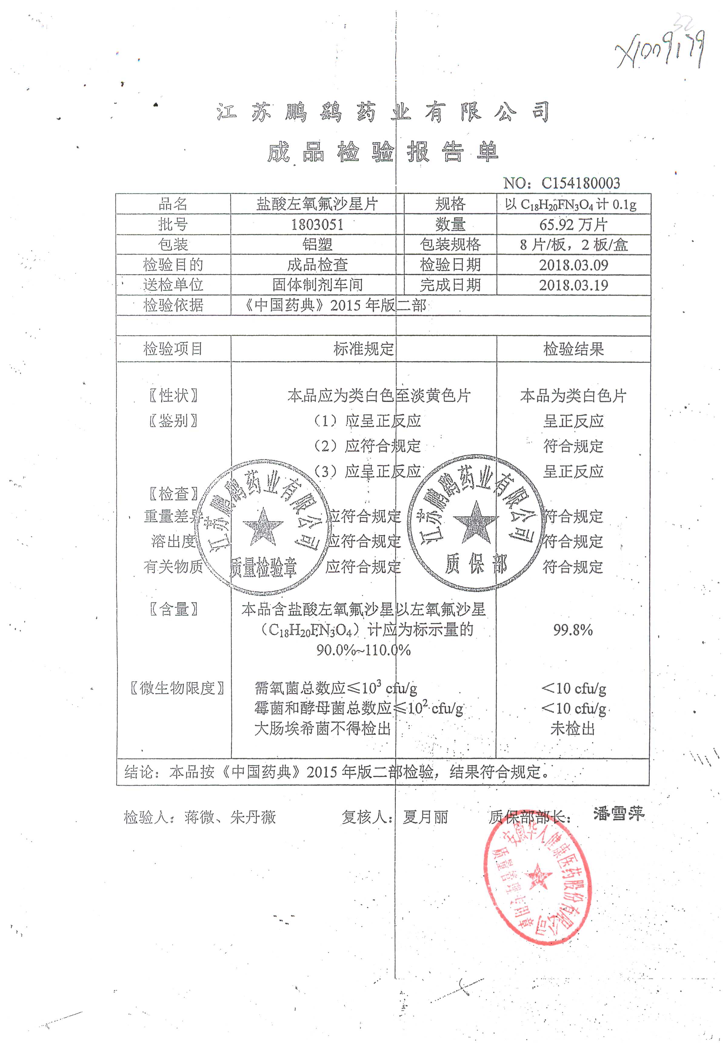 | 鹽酸左氧氟沙星片 | 16s | 1803051 | 查看詳情 |