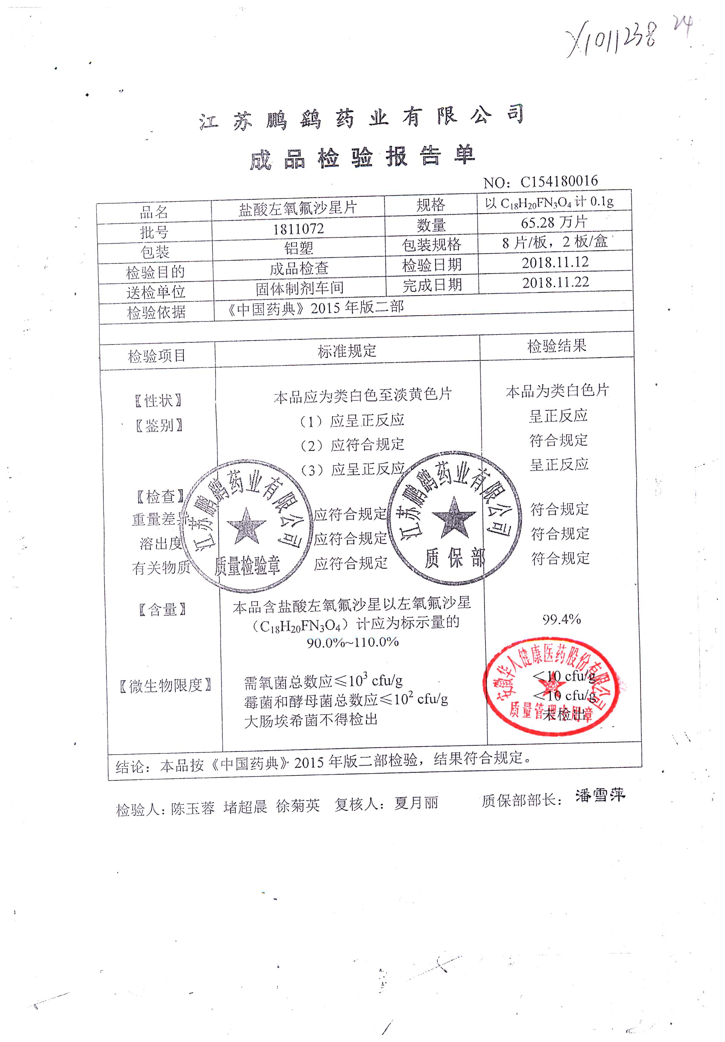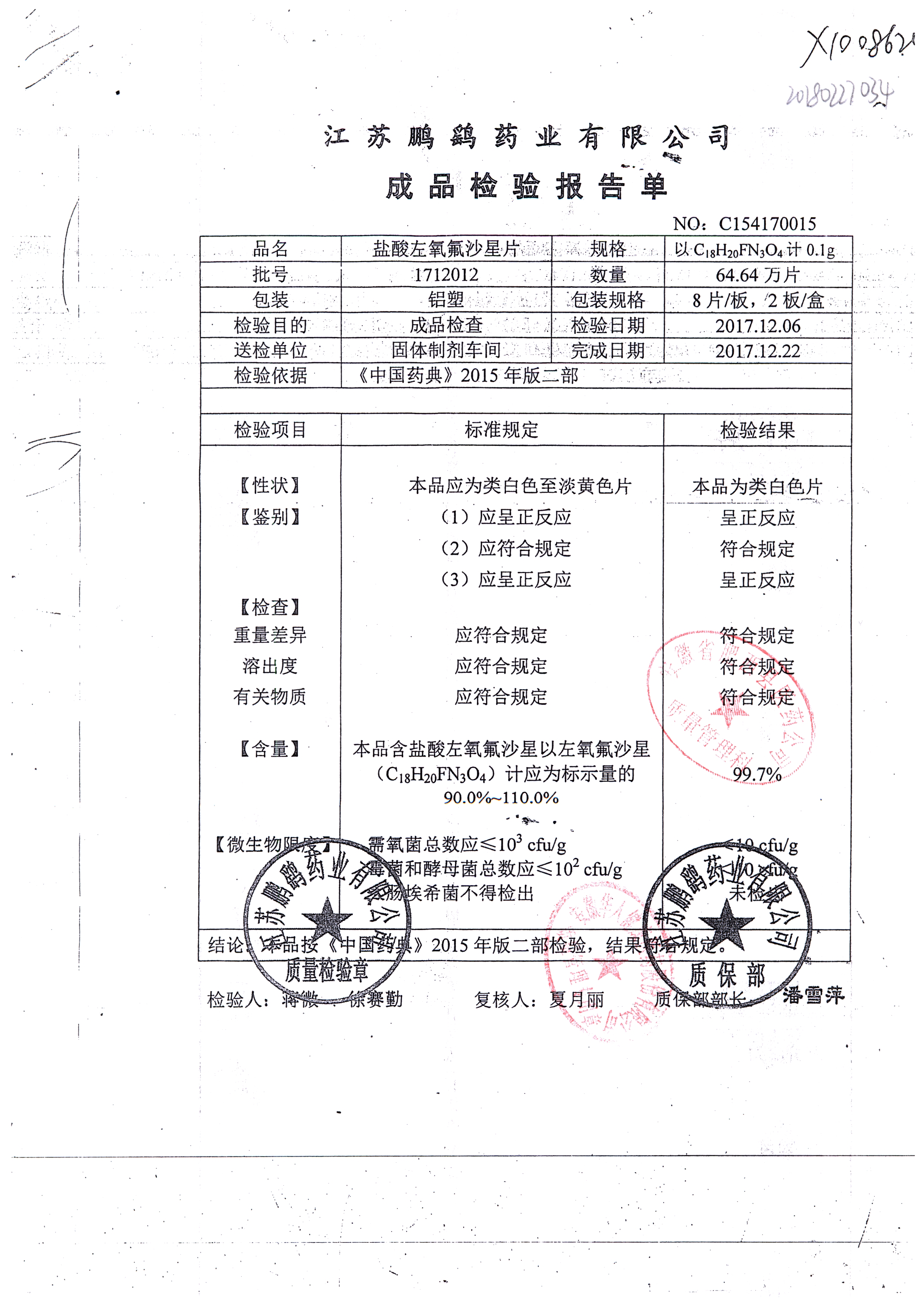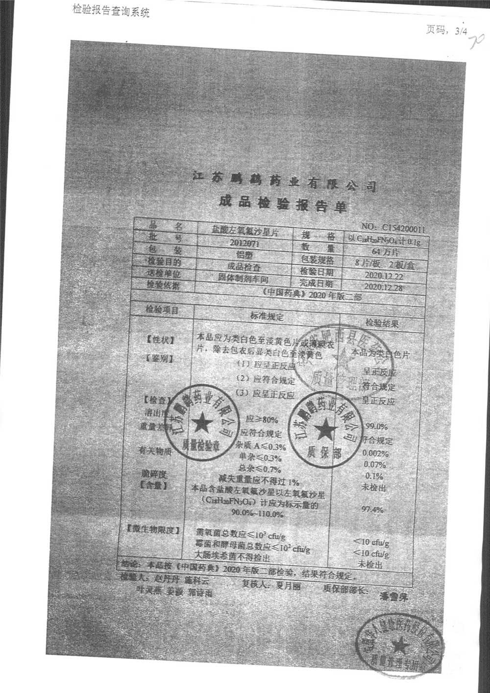 | 鹽酸左氧氟沙星片 | 16s | 2012071 | 查看詳情 |
