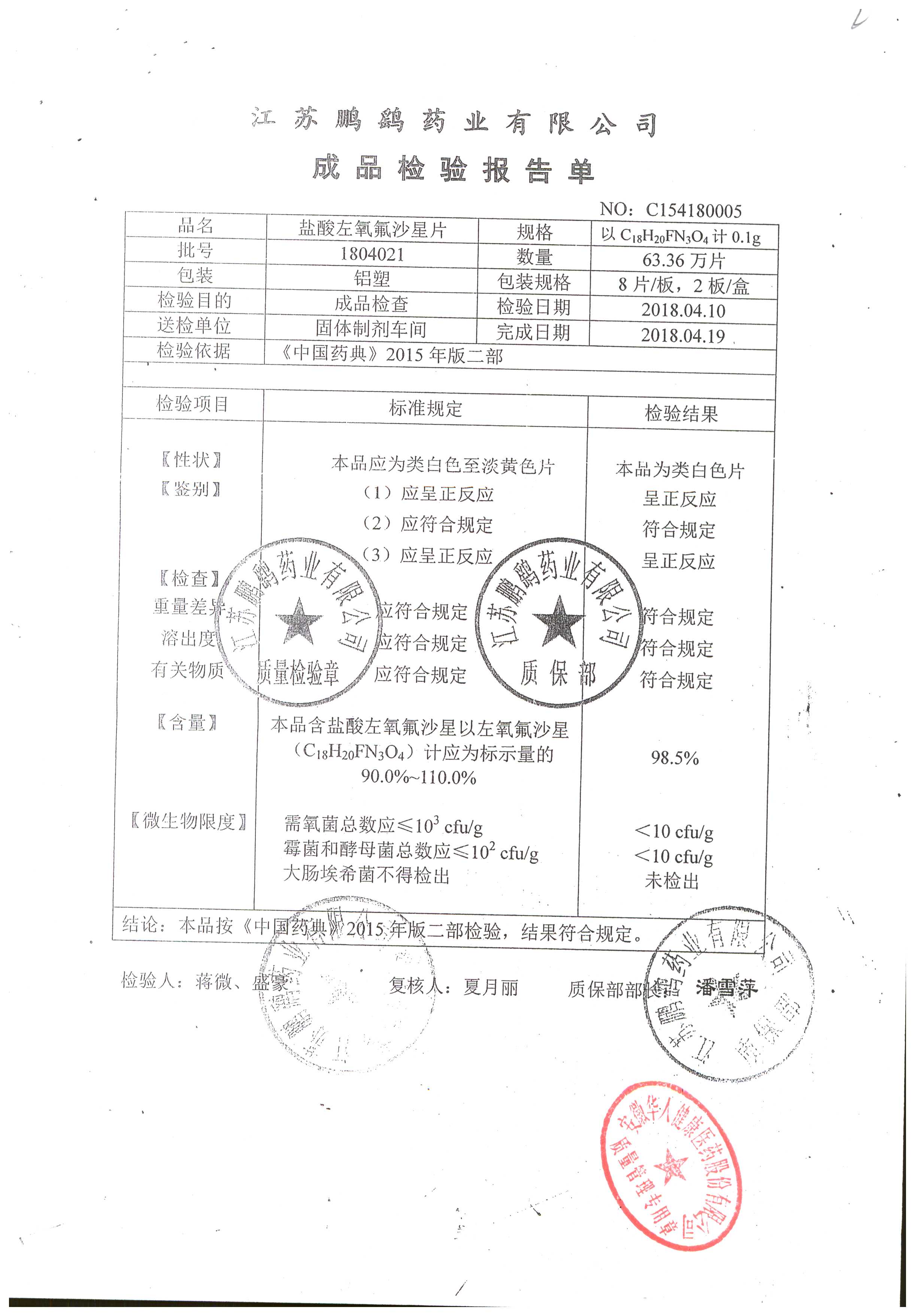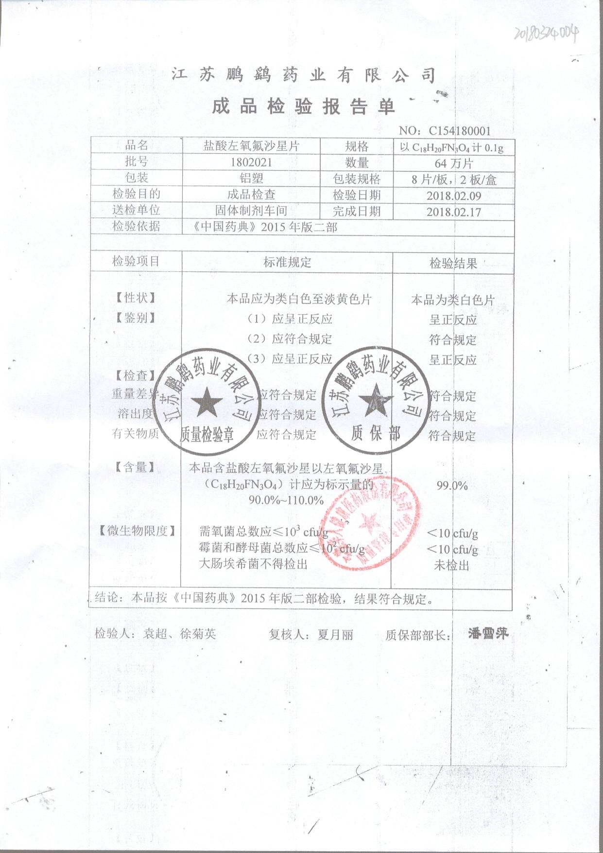 | 鹽酸左氧氟沙星片 | 16s | 1804021 | 查看詳情 |
