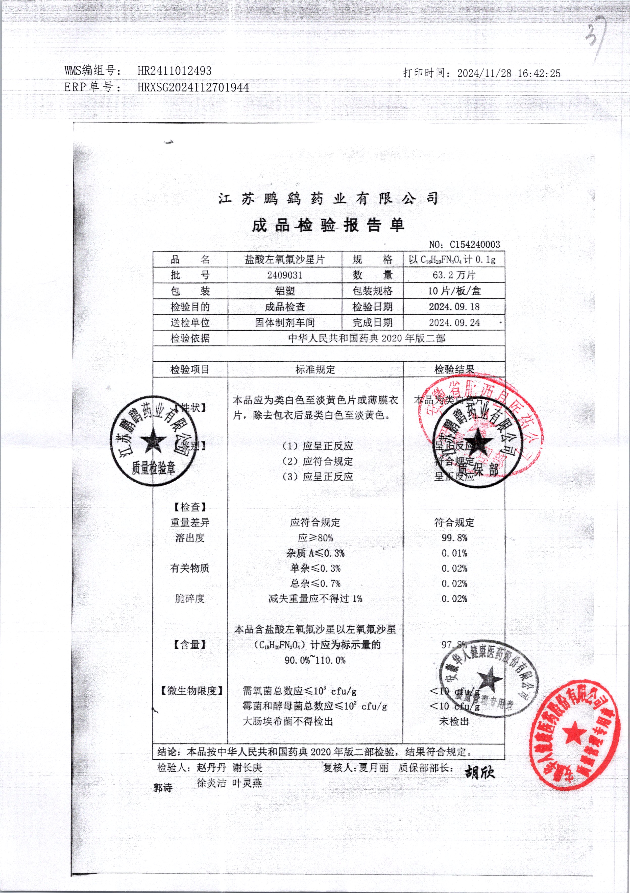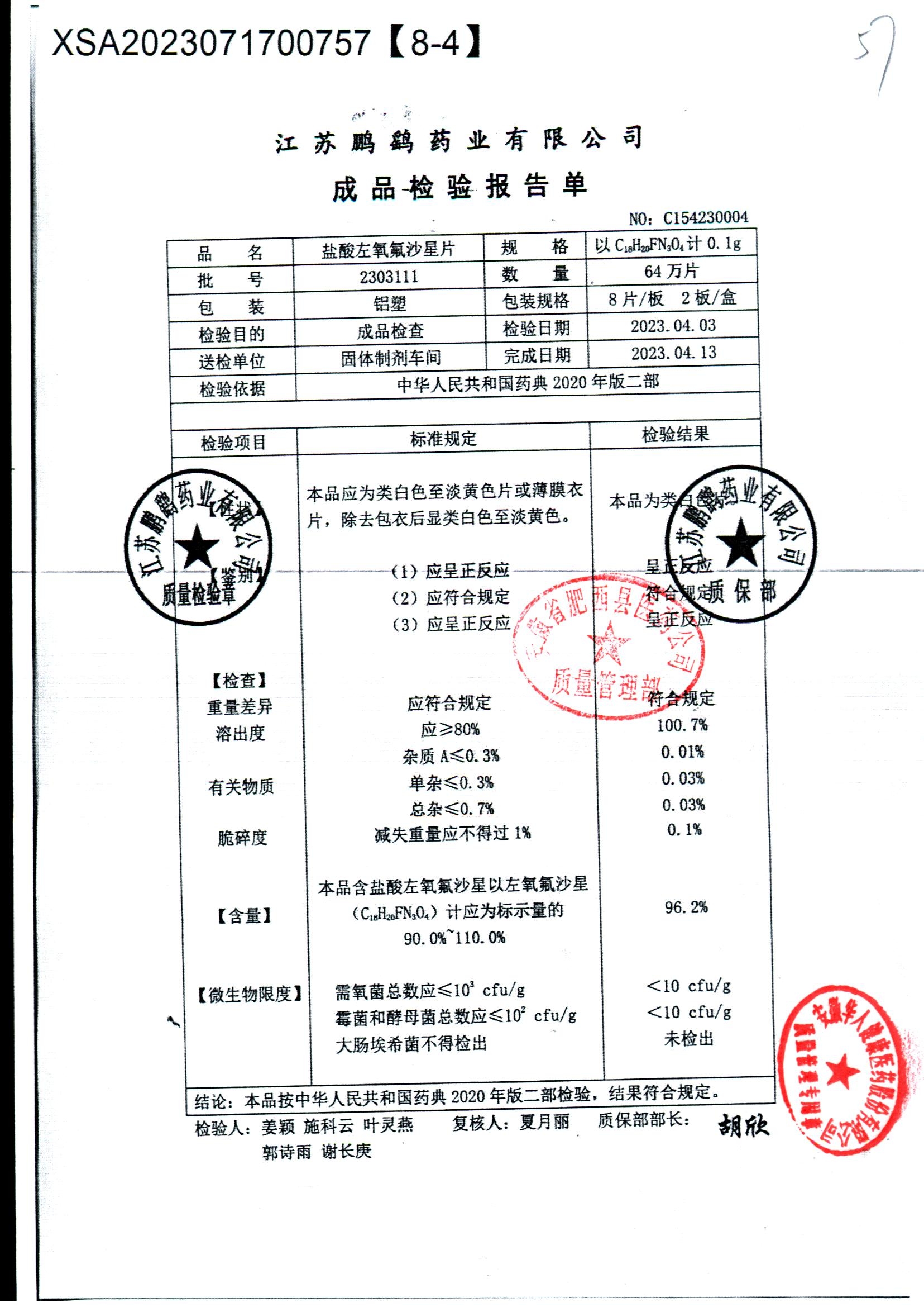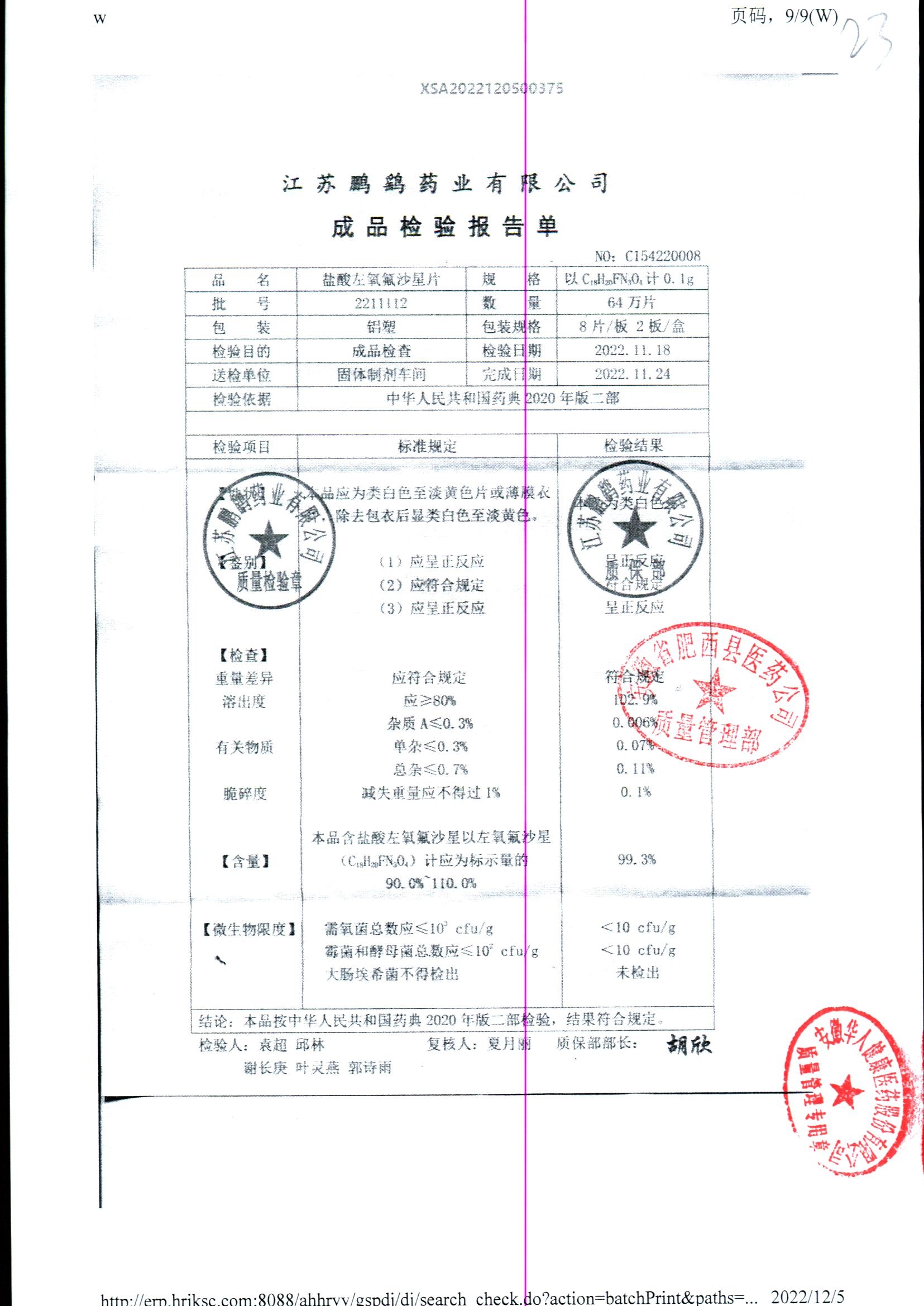 | 鹽酸左氧氟沙星片 | 16s | 2303111 | 查看詳情 |