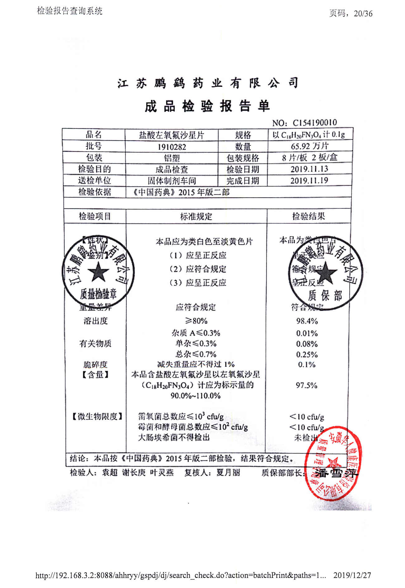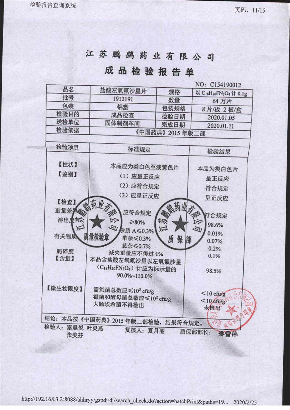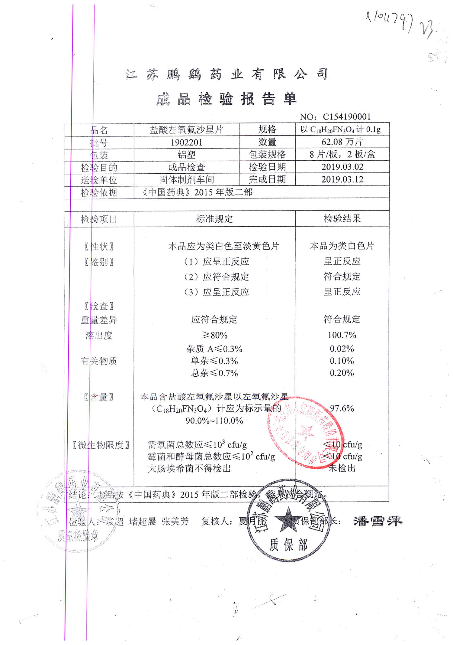 | 鹽酸左氧氟沙星片 | 16s | 1902201 | 查看詳情 |