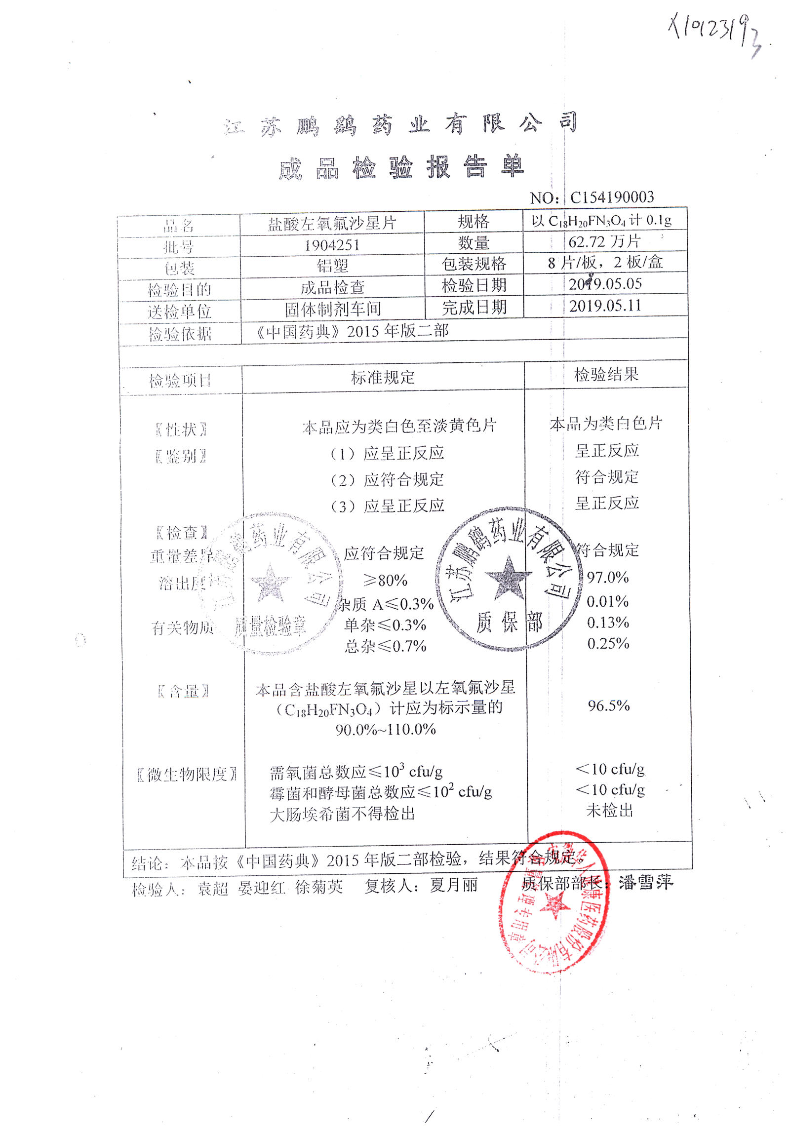 | 鹽酸左氧氟沙星片 | 16s | 1905052 | 查看詳情 |