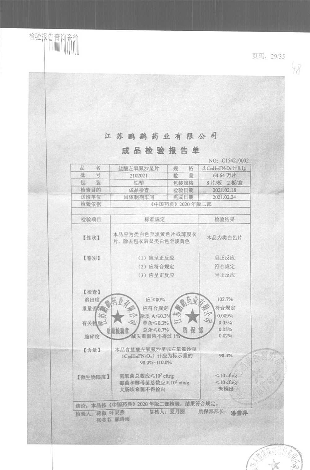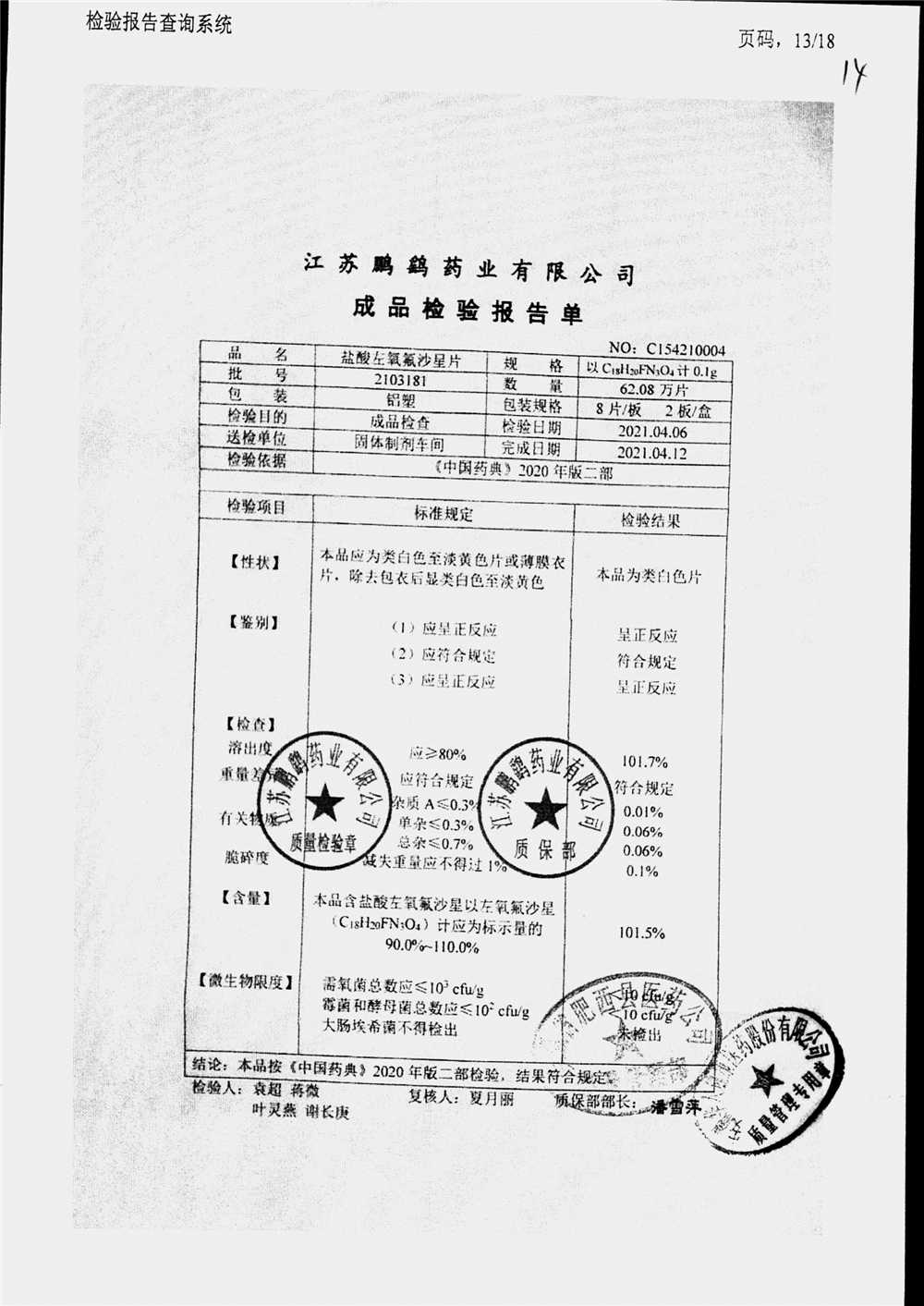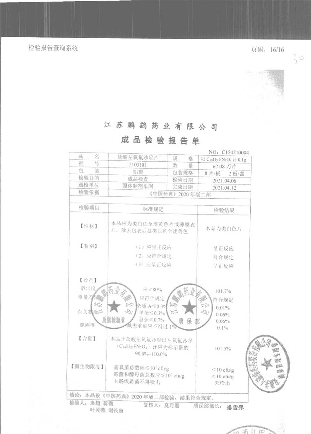 | 鹽酸左氧氟沙星片 | 16s | 2102021 | 查看詳情 |
