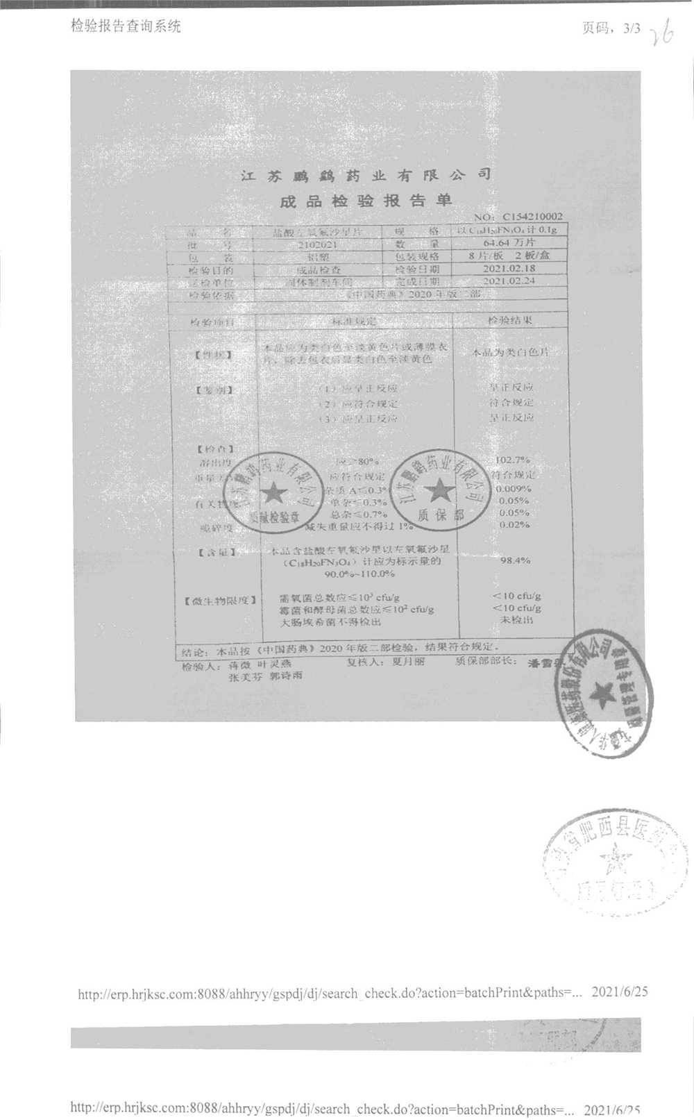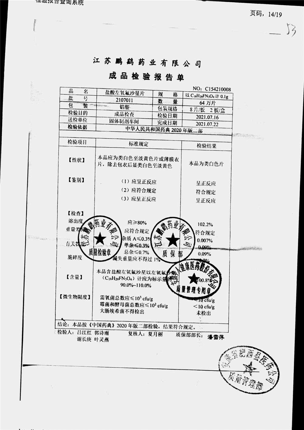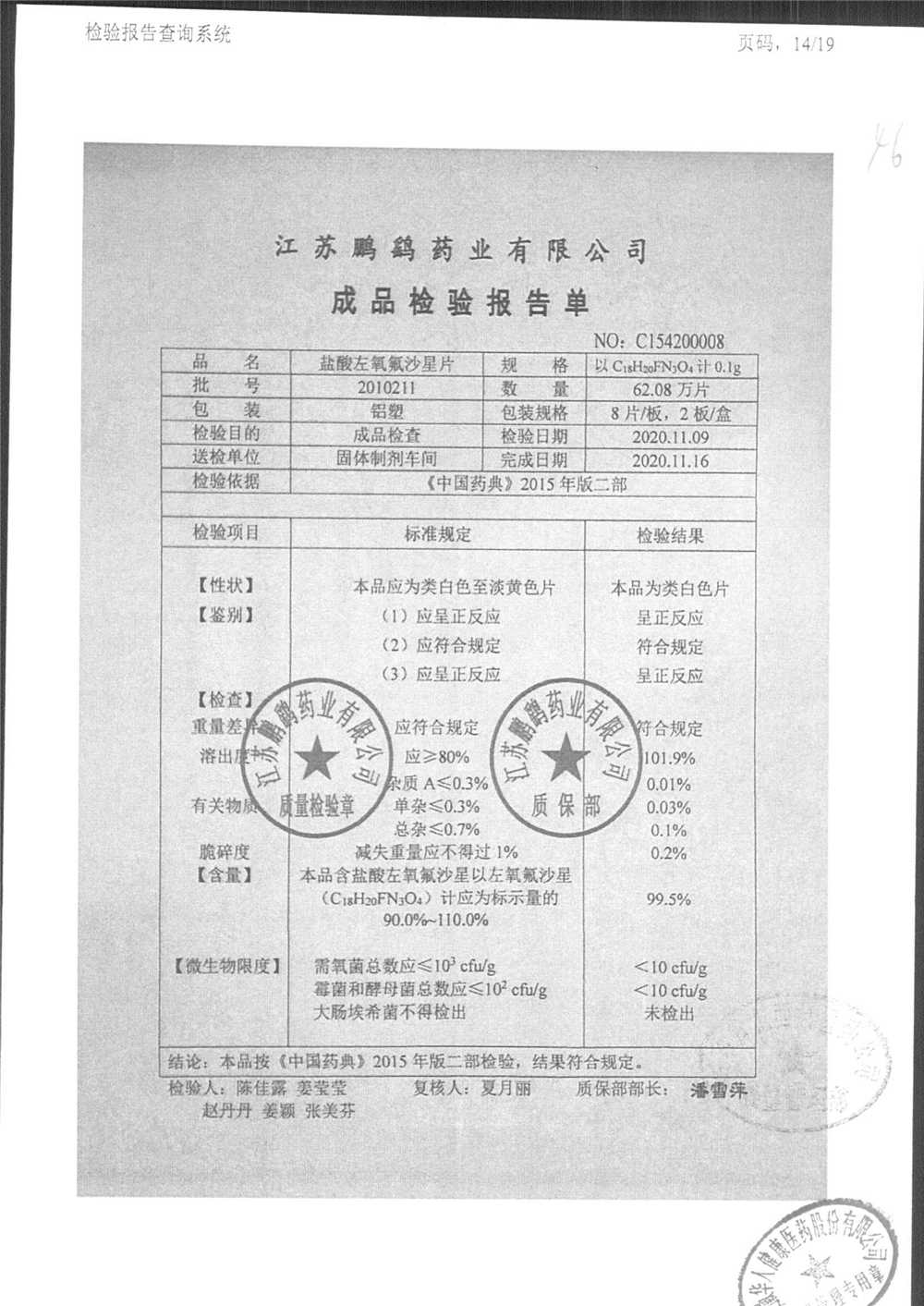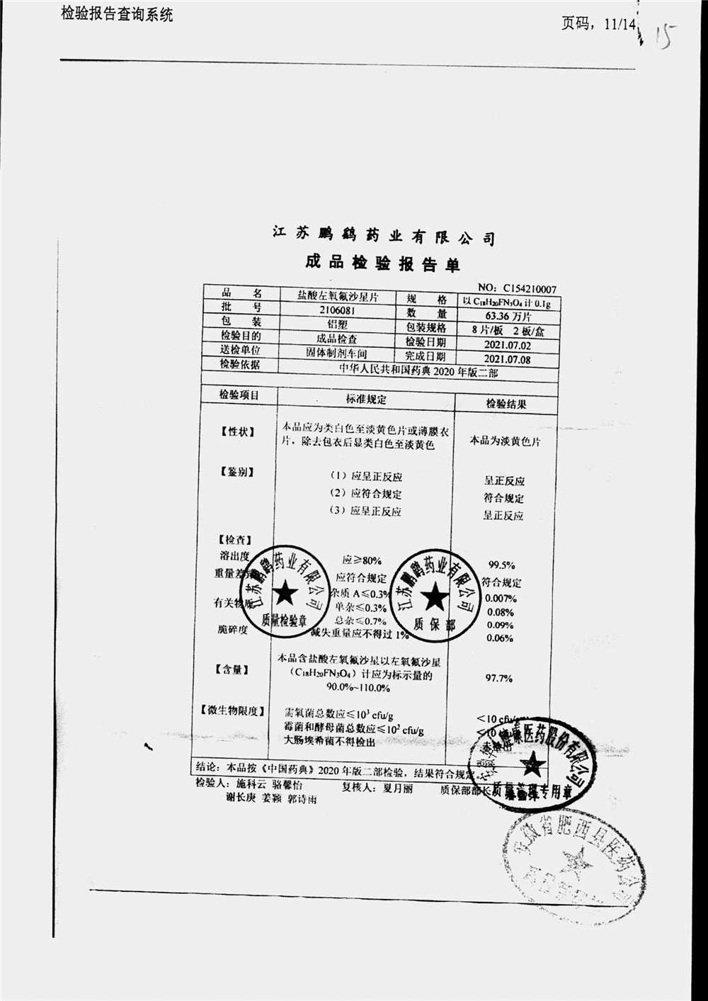 | 鹽酸左氧氟沙星片 | 16s | 2102021 | 查看詳情 |