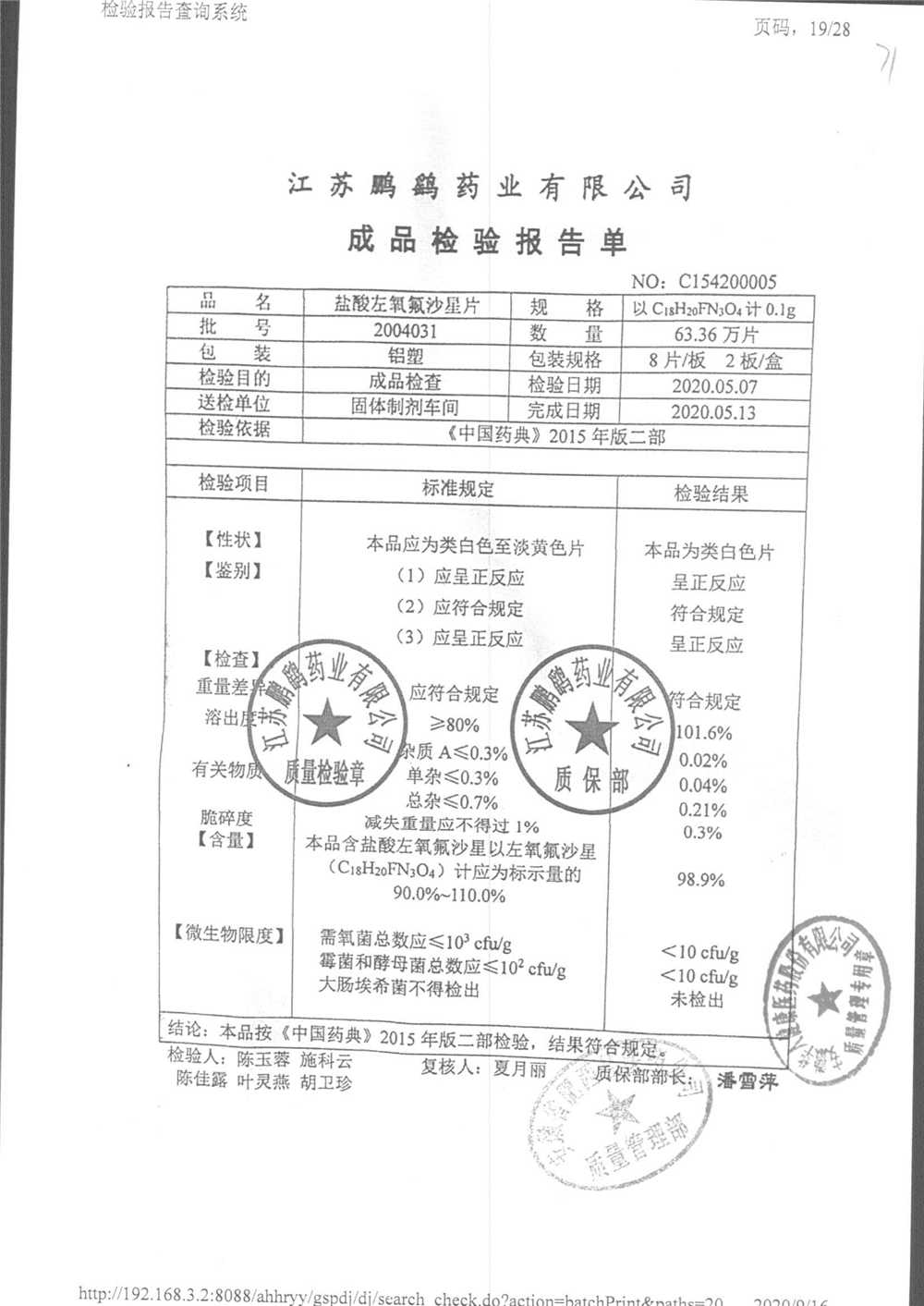 | 鹽酸左氧氟沙星片 | 16s | 2004021 | 查看詳情 |