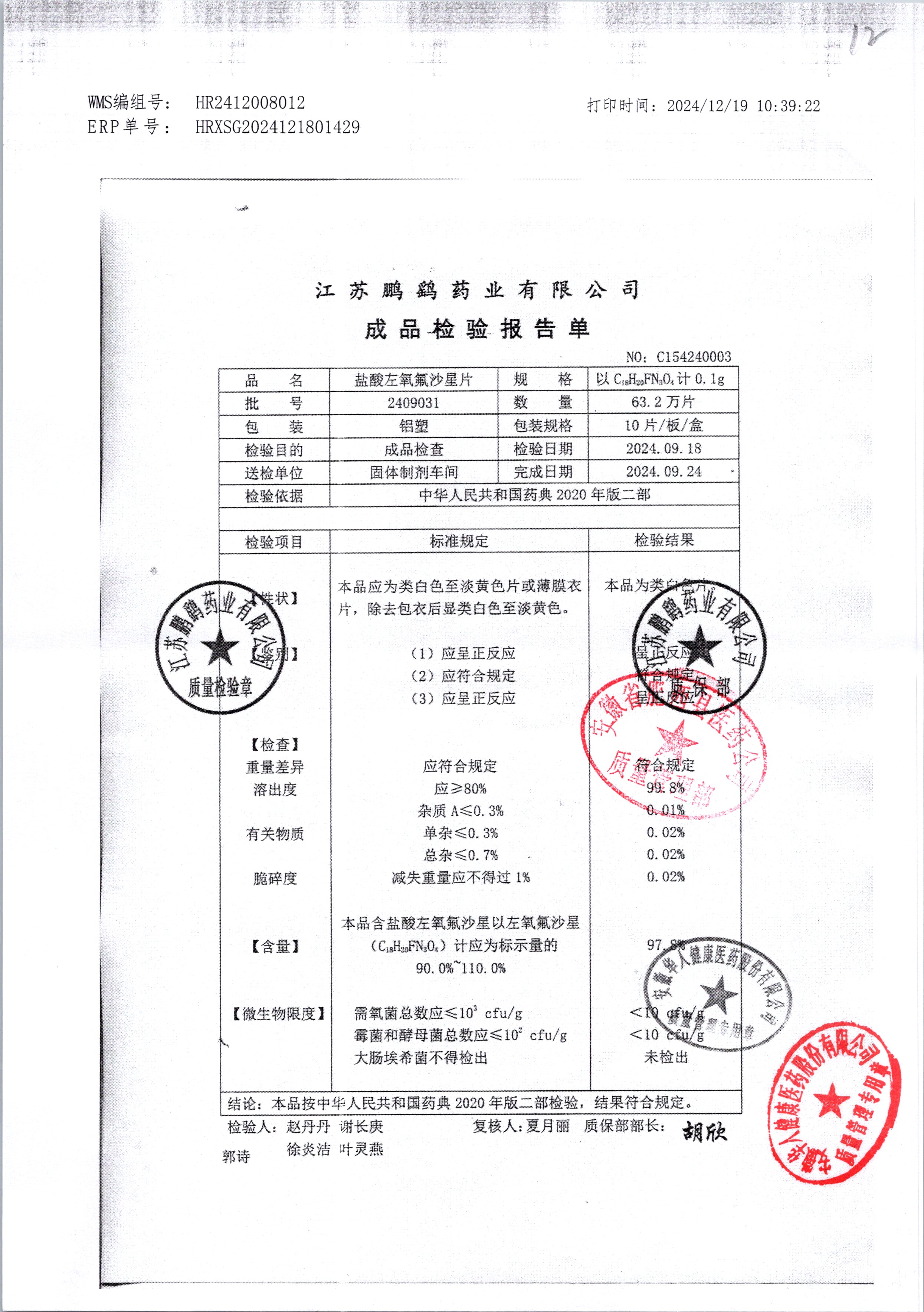| 鹽酸左氧氟沙星片 | 16s | 2409031 | 查看詳情 |