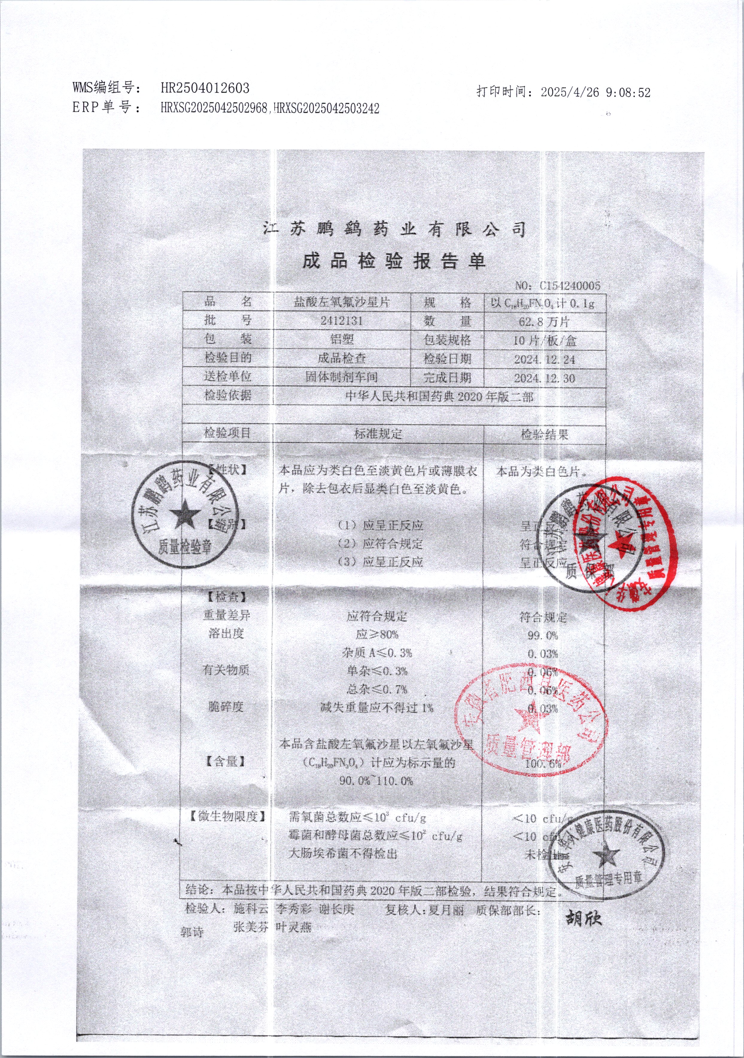 | 鹽酸左氧氟沙星片 | 16s | 2412131 | 查看詳情 |