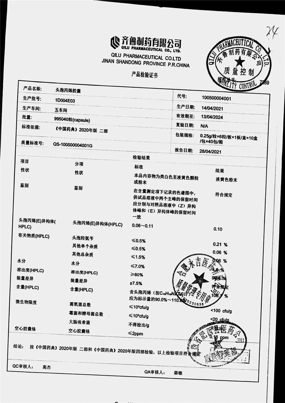 | 頭孢丙烯膠囊 | 0.25g*6s | 8J030E03 | 查看詳情 |