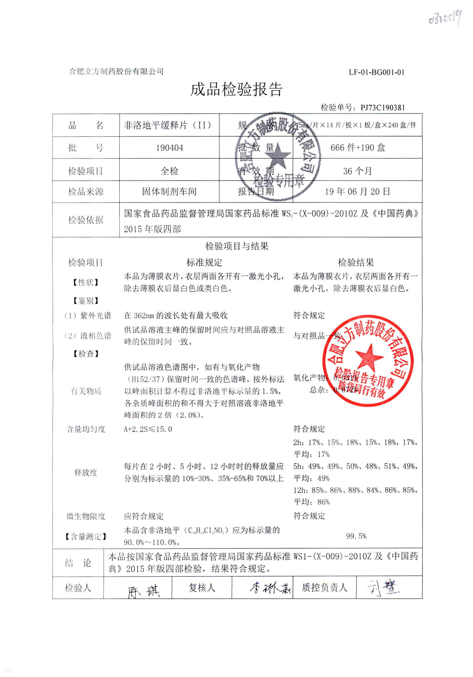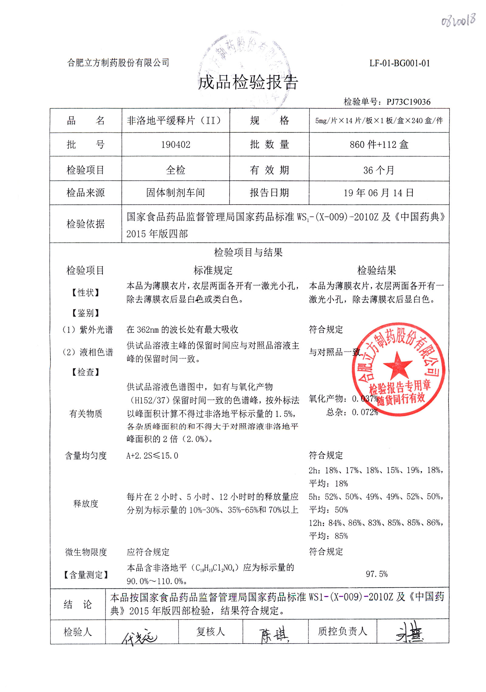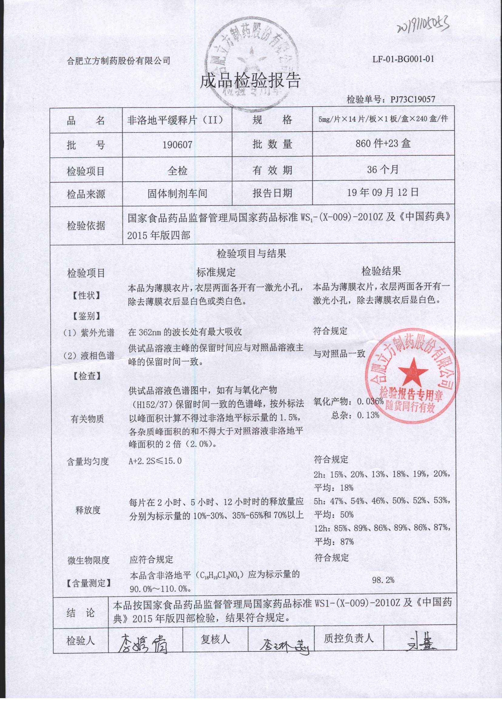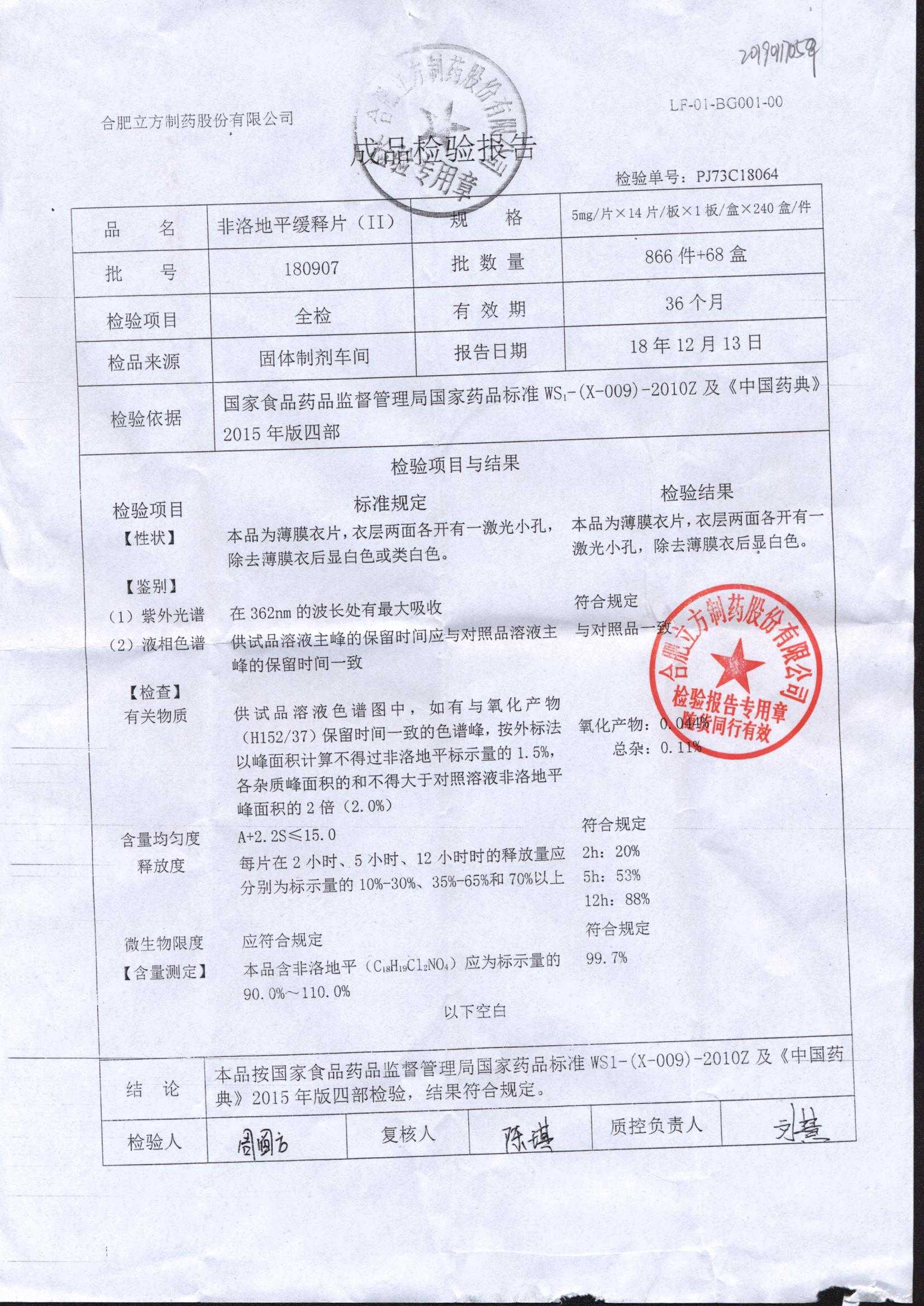 | 非洛地平緩釋片 | 5mg*14s | 190806 | 查看詳情 |