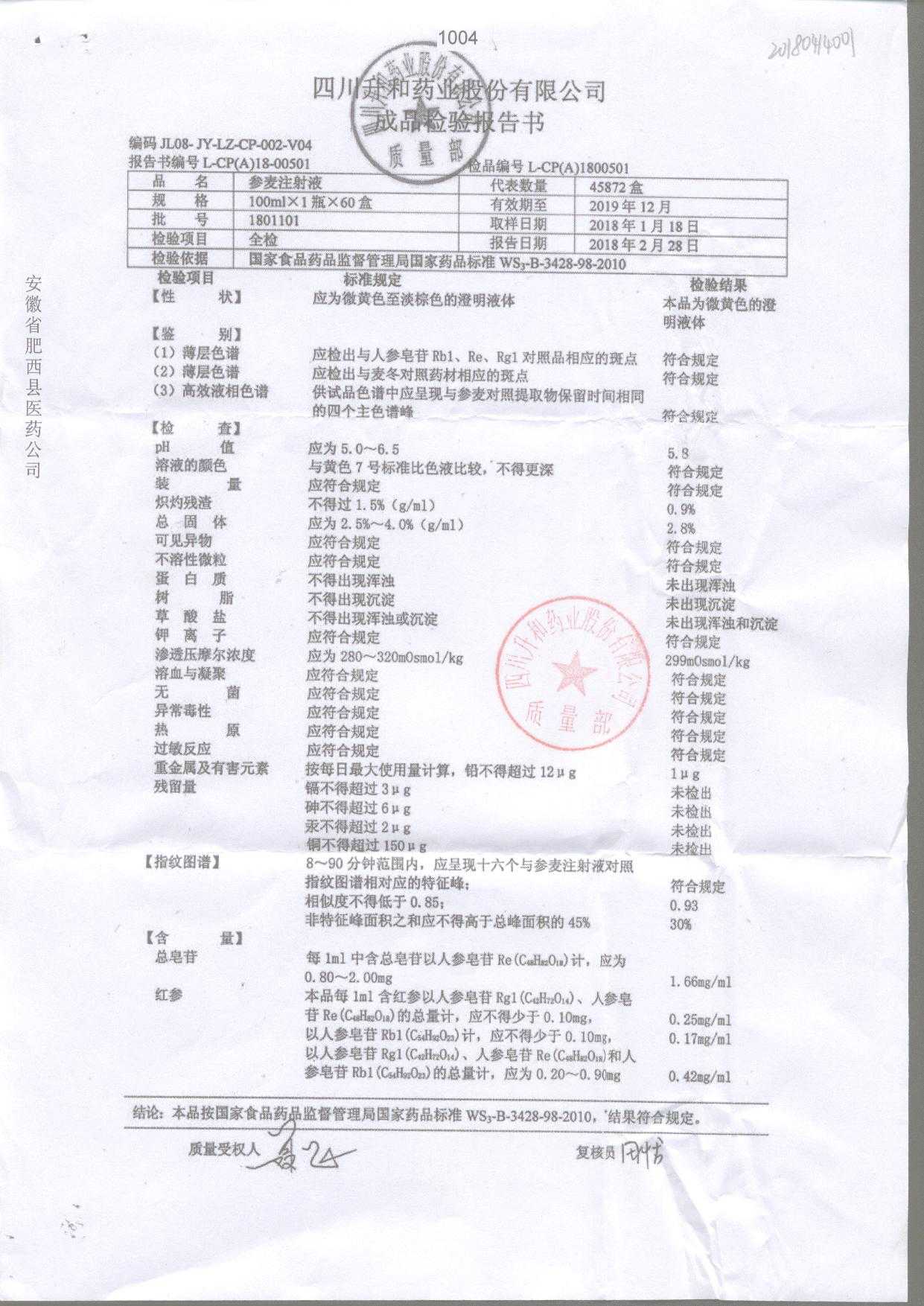 | 參麥注射液 | 100ml*1瓶 | 1801101 | 查看詳情 |