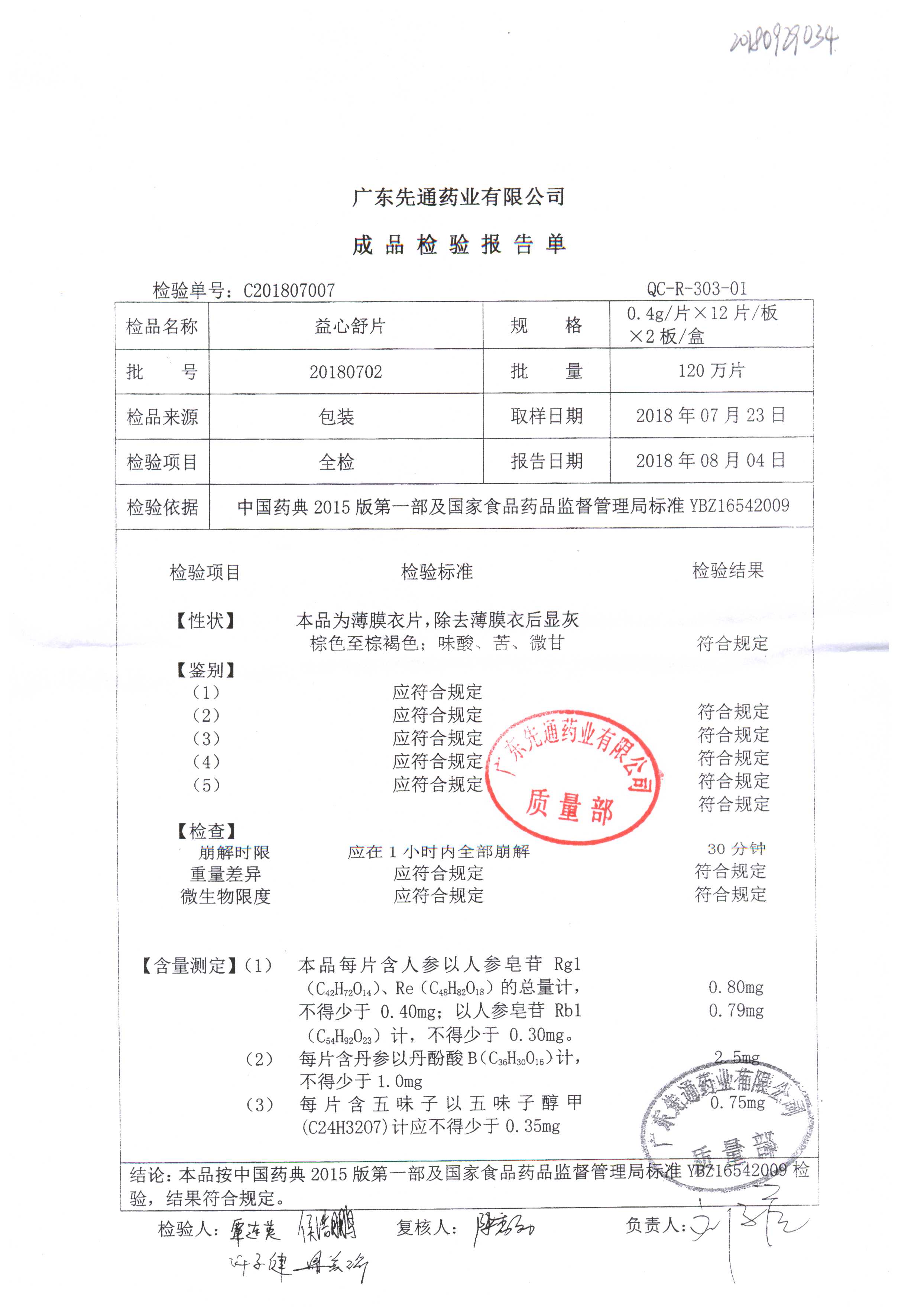 | 益心舒片 | 0.4g*24s | 20180702 | 查看詳情 |