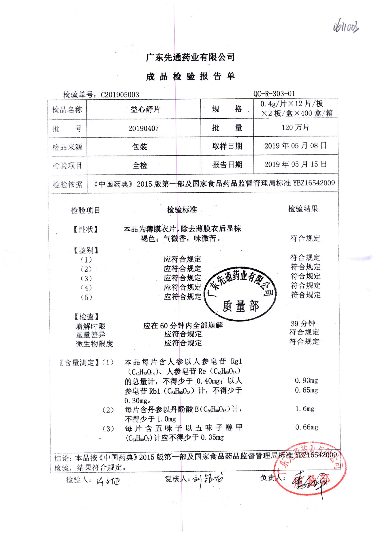 | 益心舒片 | 0.4g*24s | 20190407 | 查看詳情 |