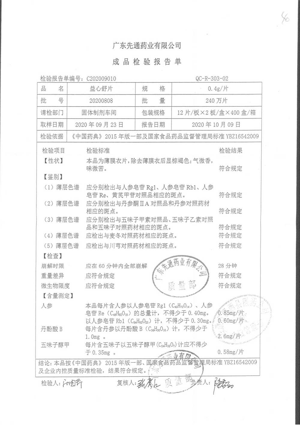| 益心舒片 | 0.4g*24s | 20201002 | 查看詳情 |