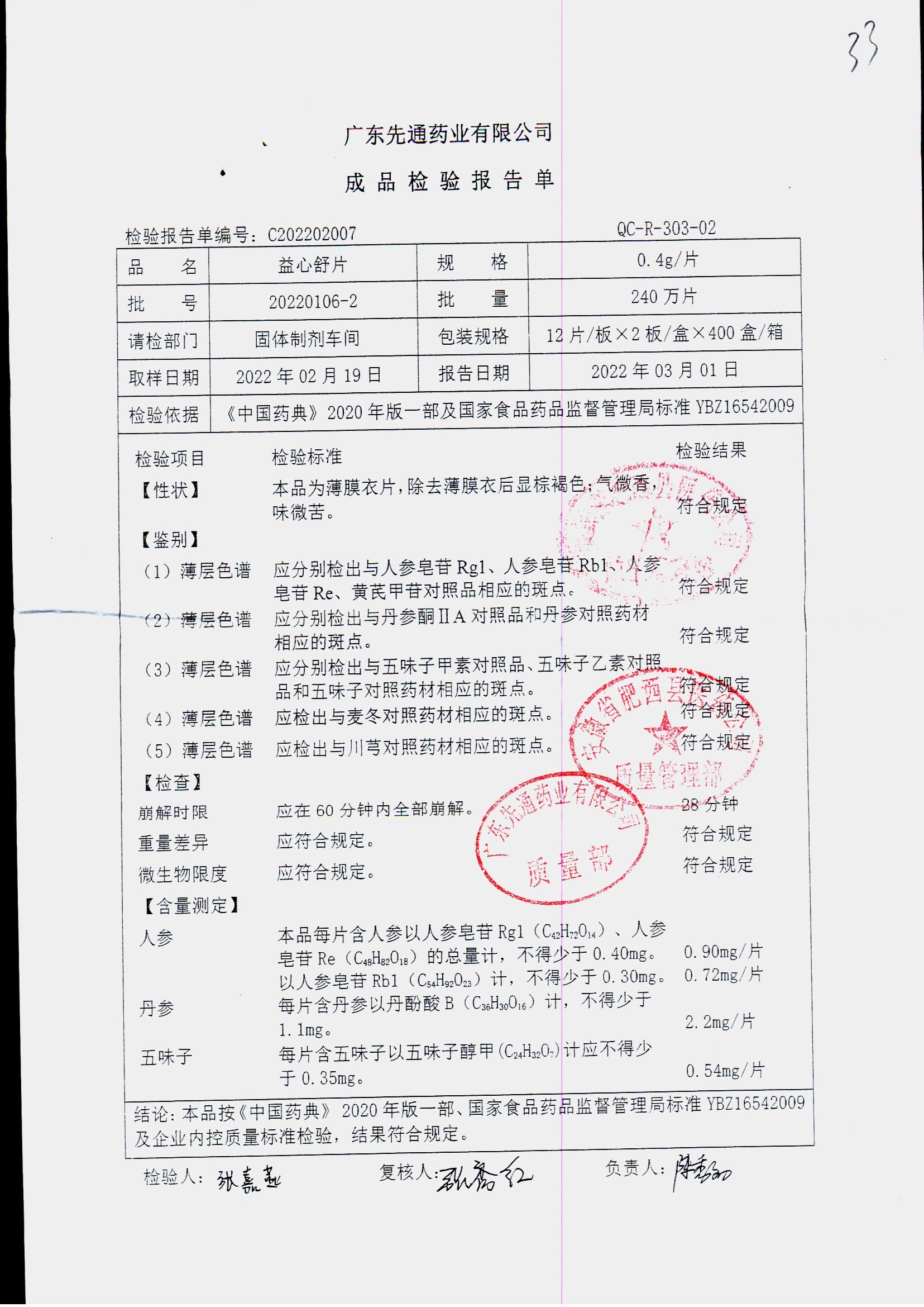 | 益心舒片 | 0.4g*24s | 20220405 | 查看詳情 |
