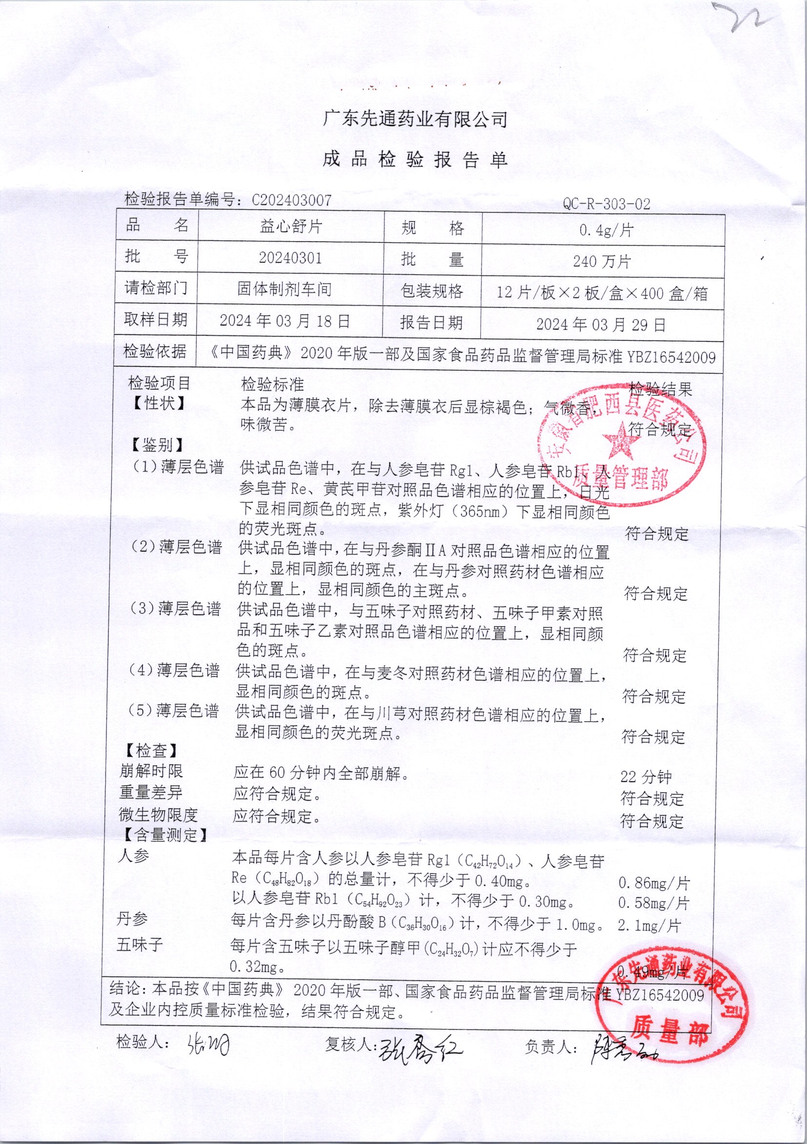 | 益心舒片 | 0.4g*24s | 20240301 | 查看詳情 |